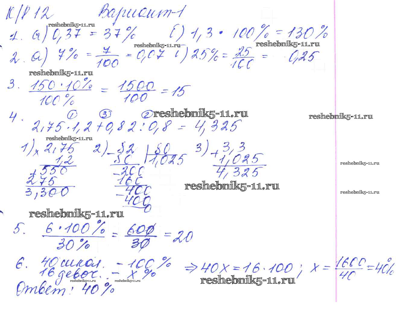 Готовая домашняя работа с ответами по Математике за 5 класс Дудницын, Кронгауз Контрольные работы УМК Экзамен 2011 ФГОС - КР-12. Варианты 1