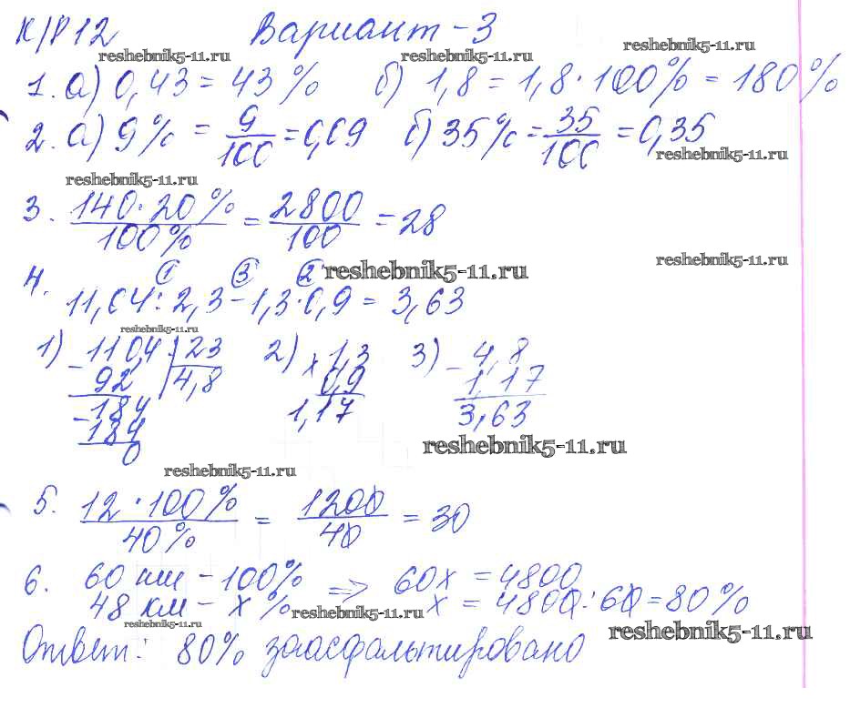Готовая домашняя работа с ответами по Математике за 5 класс Дудницын, Кронгауз Контрольные работы УМК Экзамен 2011 ФГОС - КР-12. Варианты 3