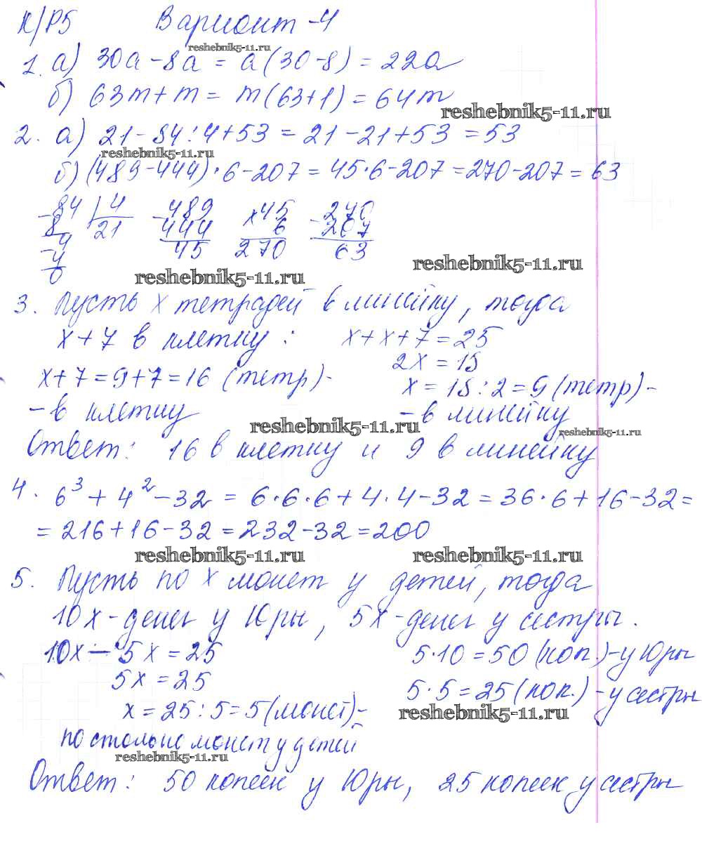 Готовая домашняя работа с ответами по Математике за 5 класс Дудницын, Кронгауз Контрольные работы УМК Экзамен 2011 ФГОС - КР-5. Варианты 4