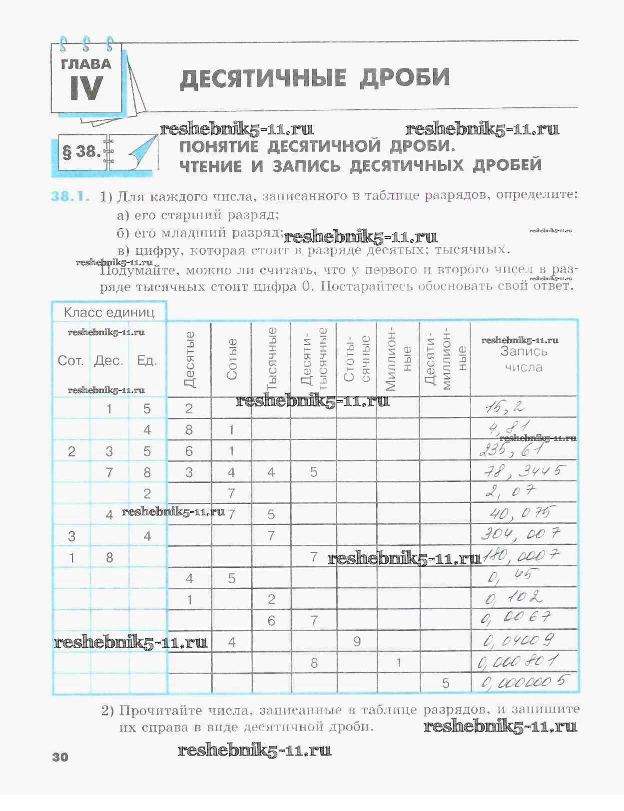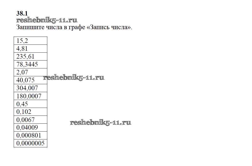 Готовая домашняя работа с ответами по Математике за 5 класс Зубарева Рабочая тетрадь УМК Часть 1, 2 Мнемозина 2014 ФГОС - §38. Понятие десятичной дроби. Чтение и запись десятичных дробей 1
