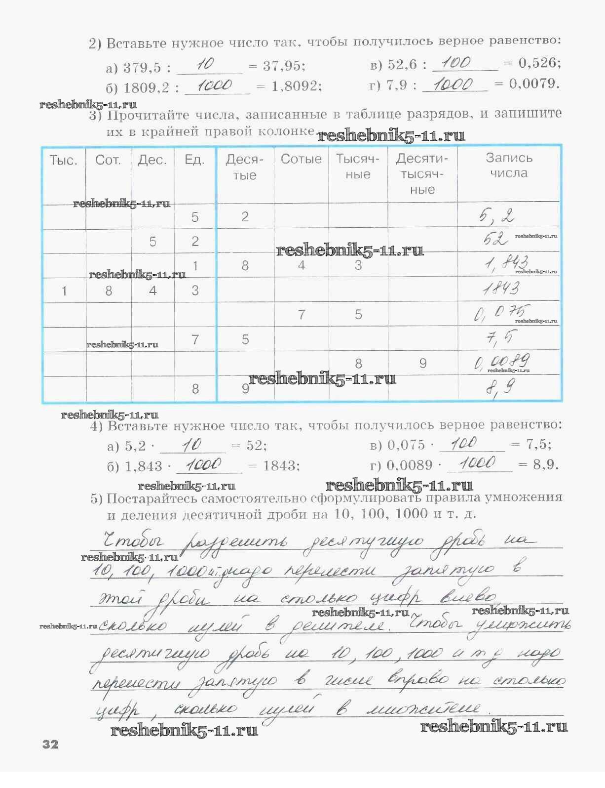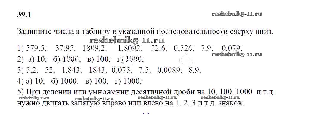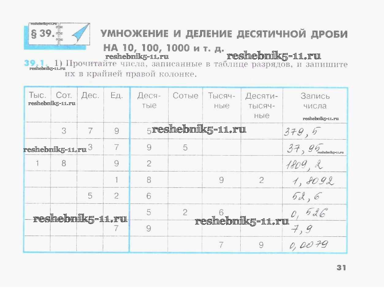 Готовая домашняя работа с ответами по Математике за 5 класс Зубарева Рабочая тетрадь УМК Часть 1, 2 Мнемозина 2014 ФГОС - §39. Умножение и деление десятичной дроби на 10, 100, 1000 и т. д.. 1
