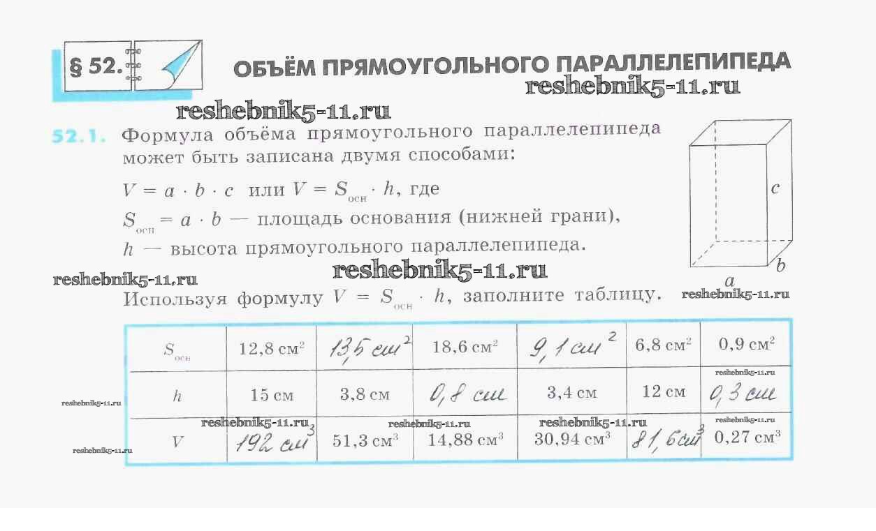 Готовая домашняя работа с ответами по Математике за 5 класс Зубарева Рабочая тетрадь УМК Часть 1, 2 Мнемозина 2014 ФГОС - §52. Объём прямоугольного параллелепипеда 1
