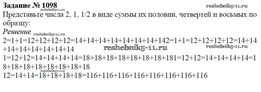 Готовая домашняя работа с ответами по Математике за 5 класс Виленкин, Жохов, Чесноков, Шварцбурд Учебник Мнемозина 2013 ФГОС - Глава 2. Дробные числа (упражнения с 850 по 1849) 1098