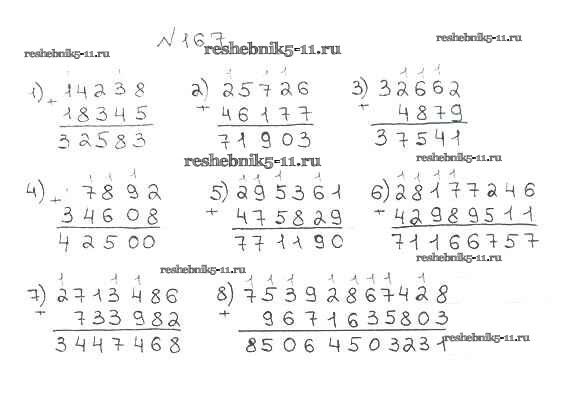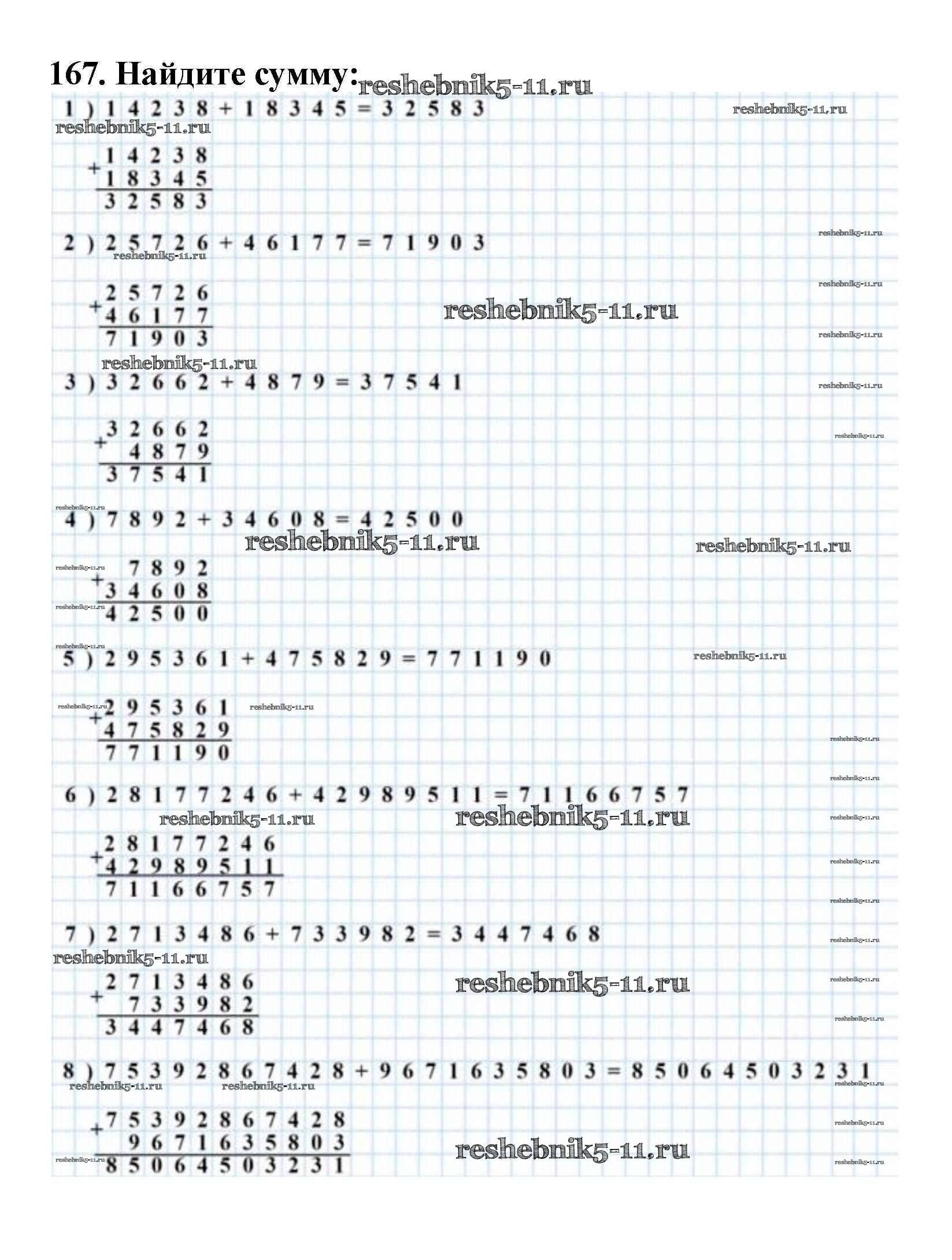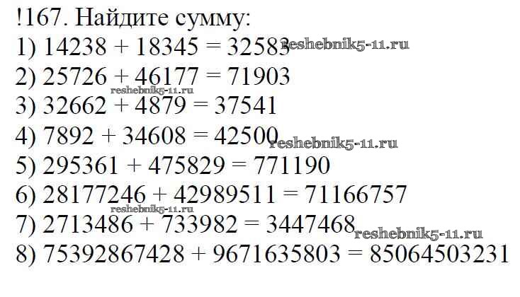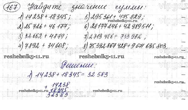 Готовая домашняя работа с ответами по Математике за 5 класс Мерзляк, Полонский, Якир Учебник Алгоритм успеха Вентана-граф 2016 ФГОС - § 7. Сложение натуральных чисел. Свойства сложения 167