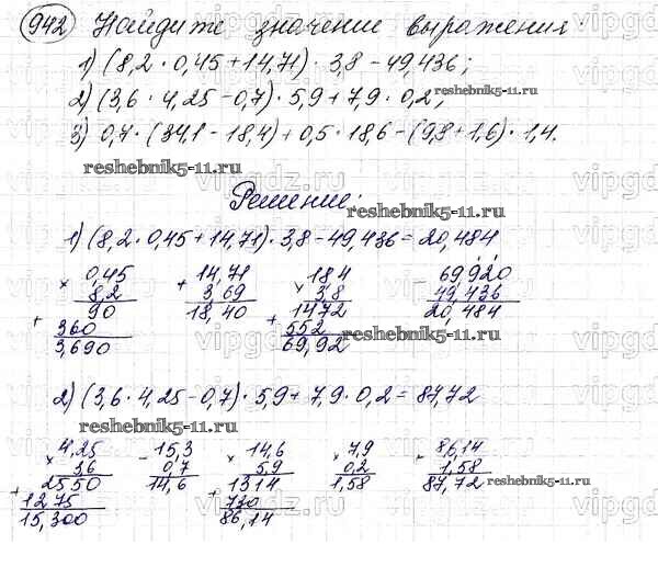 Готовая домашняя работа с ответами по Математике за 5 класс Мерзляк, Полонский, Якир Учебник Алгоритм успеха Вентана-граф 2016 ФГОС - §34. Умножение десятичных дробей 942