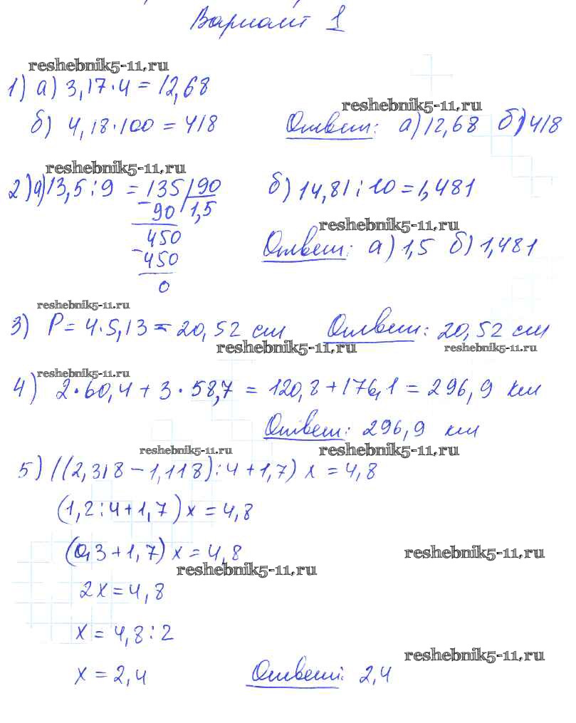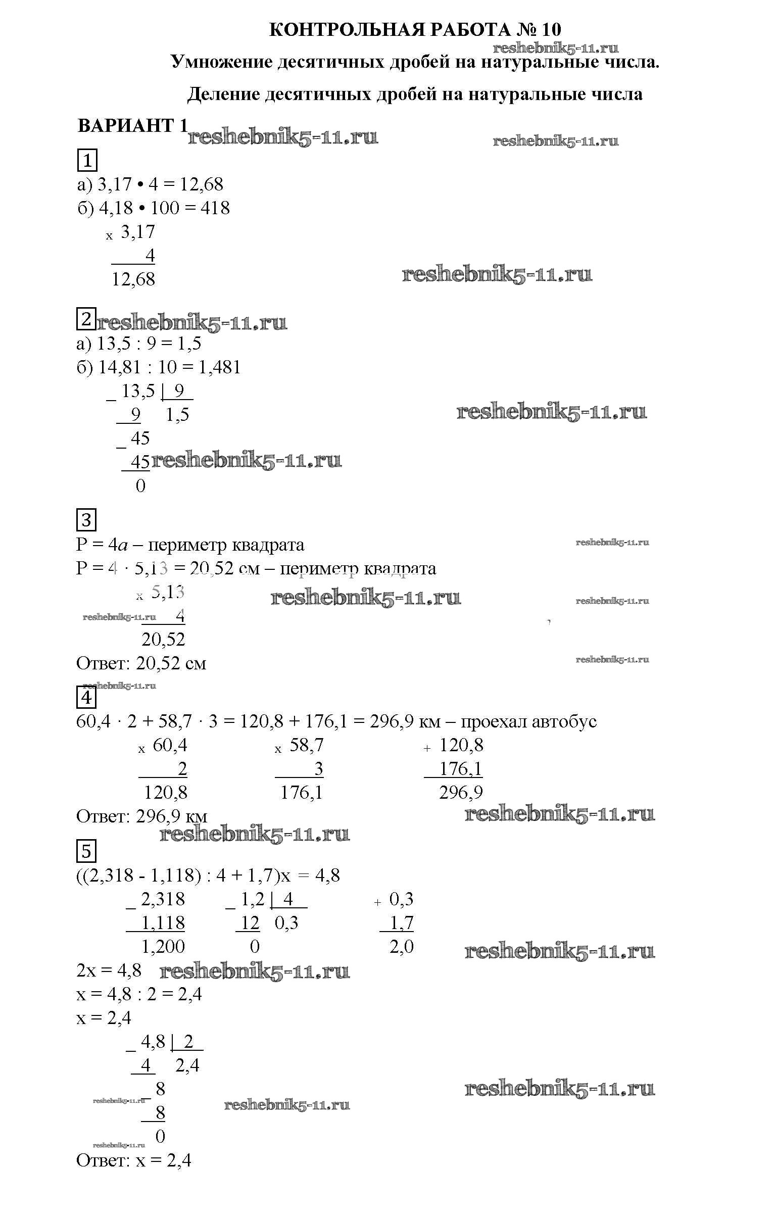 Готовая домашняя работа с ответами по Математике за 5 класс Попов Дидактические материалы УМК Экзамен 2017 ФГОС - КР №10. Умножение и деление десятичных дробей на натуральные числа вариант №1