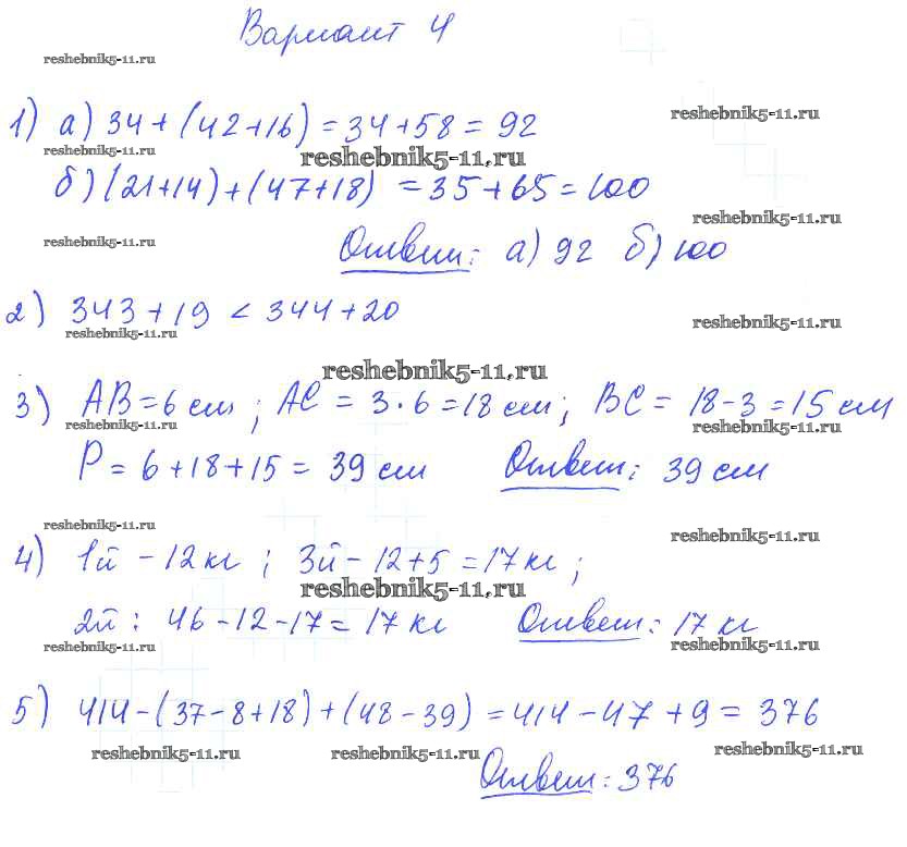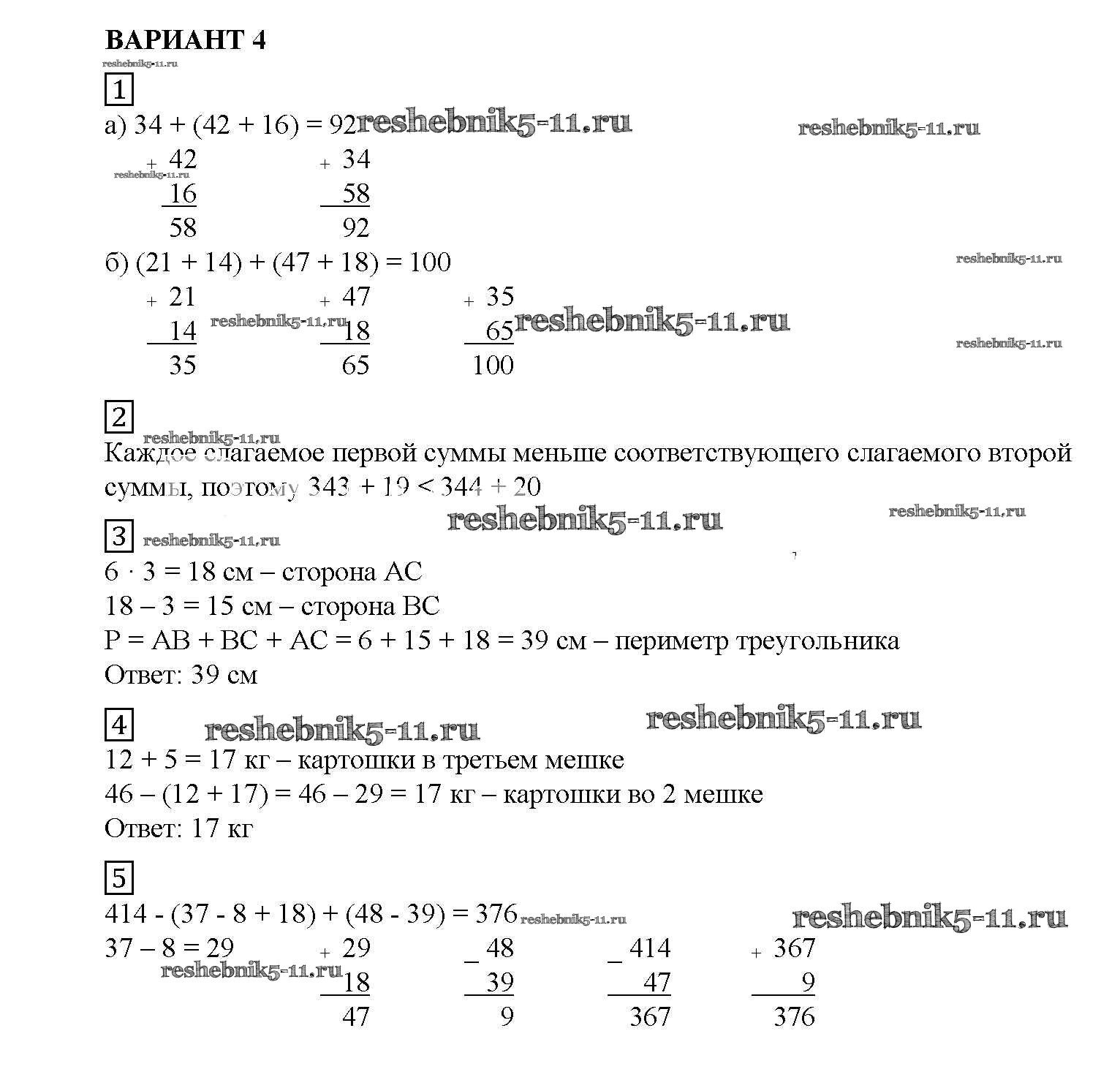 Готовая домашняя работа с ответами по Математике за 5 класс Попов Дидактические материалы УМК Экзамен 2017 ФГОС - КР №2. Сложение натуральных чисел и его свойства. Вычитание вариант №4