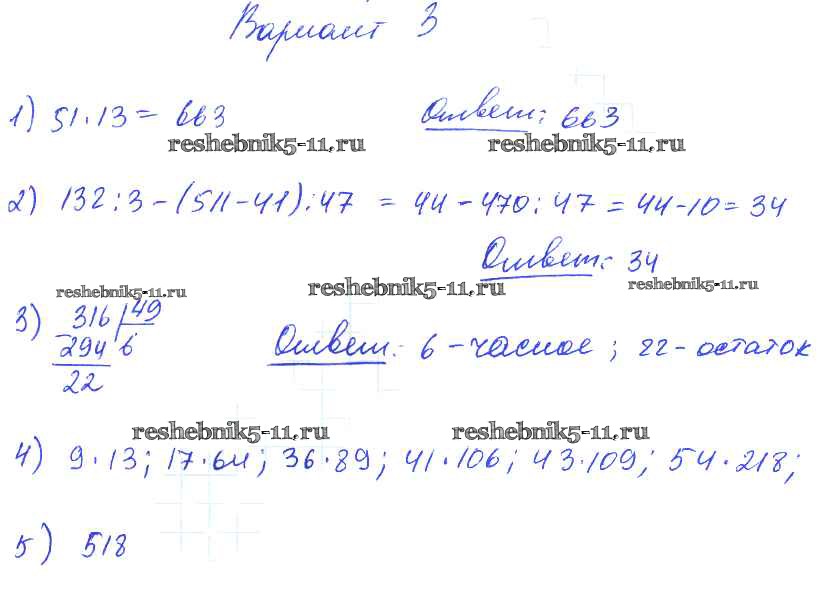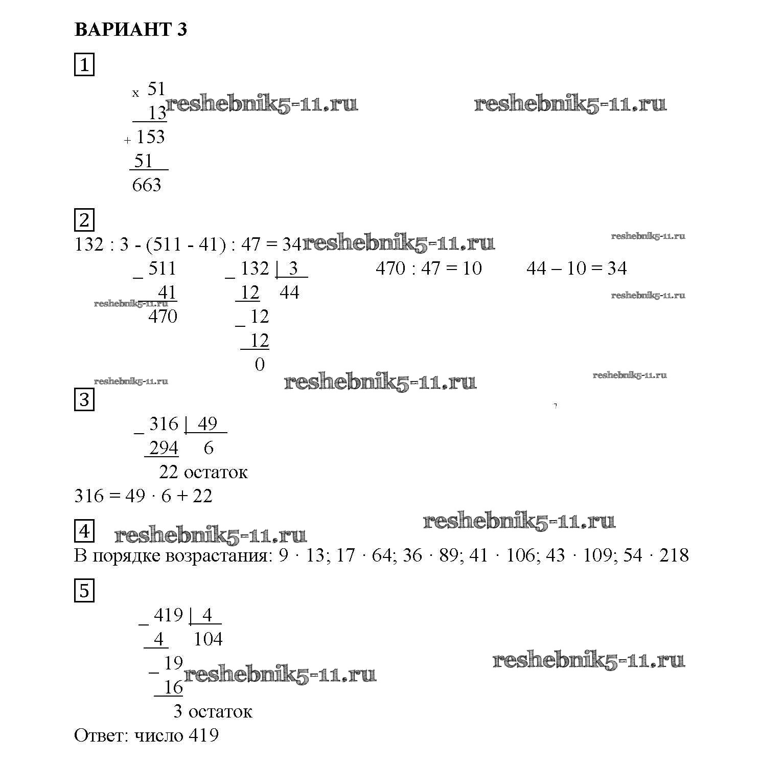 Готовая домашняя работа с ответами по Математике за 5 класс Попов Дидактические материалы УМК Экзамен 2017 ФГОС - КР №4. Умножение натуральных чисел и его свойства. Деление. Деление с остатком вариант №3