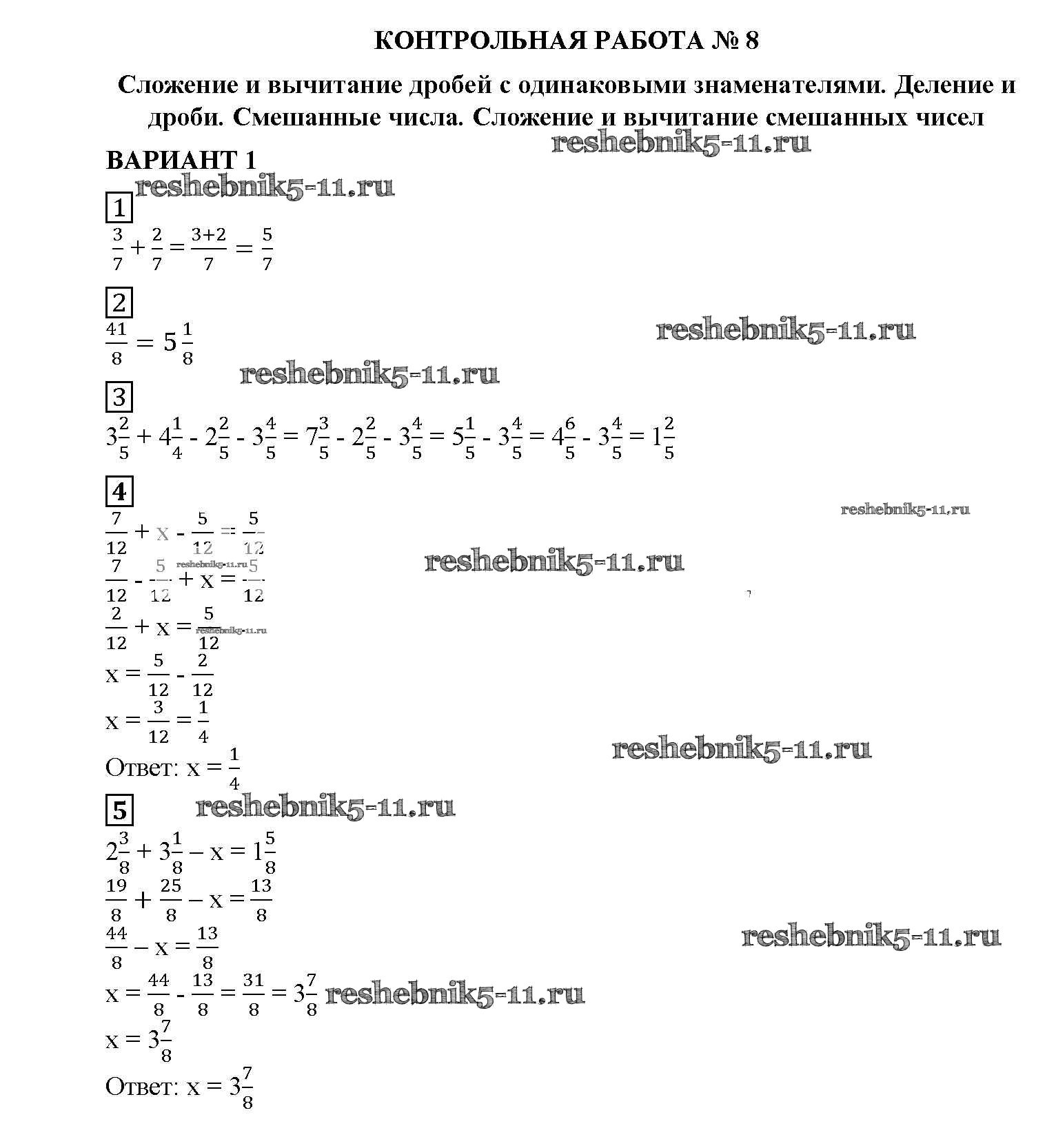 Готовая домашняя работа с ответами по Математике за 5 класс Попов Дидактические материалы УМК Экзамен 2017 ФГОС - КР №8. Сложение и вычитание дробей с одинаковыми знаменателями. Деление и дроби вариант №1