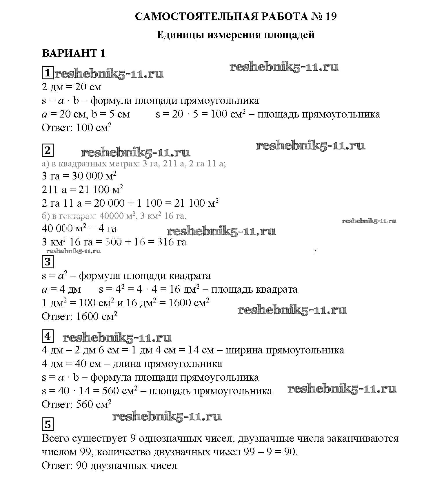 Готовая домашняя работа с ответами по Математике за 5 класс Попов Дидактические материалы УМК Экзамен 2017 ФГОС - СР №19. Единицы измерения площадей вариант №1