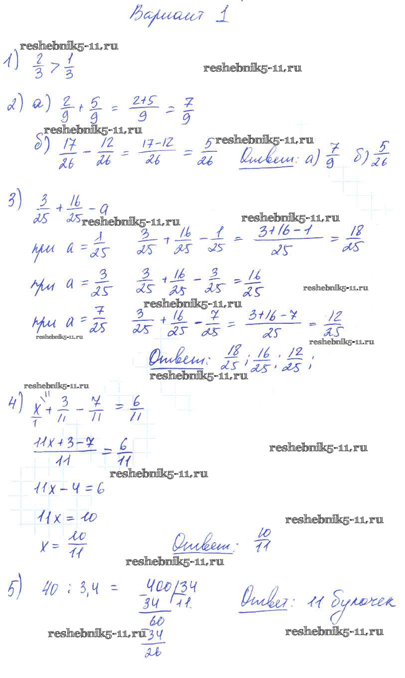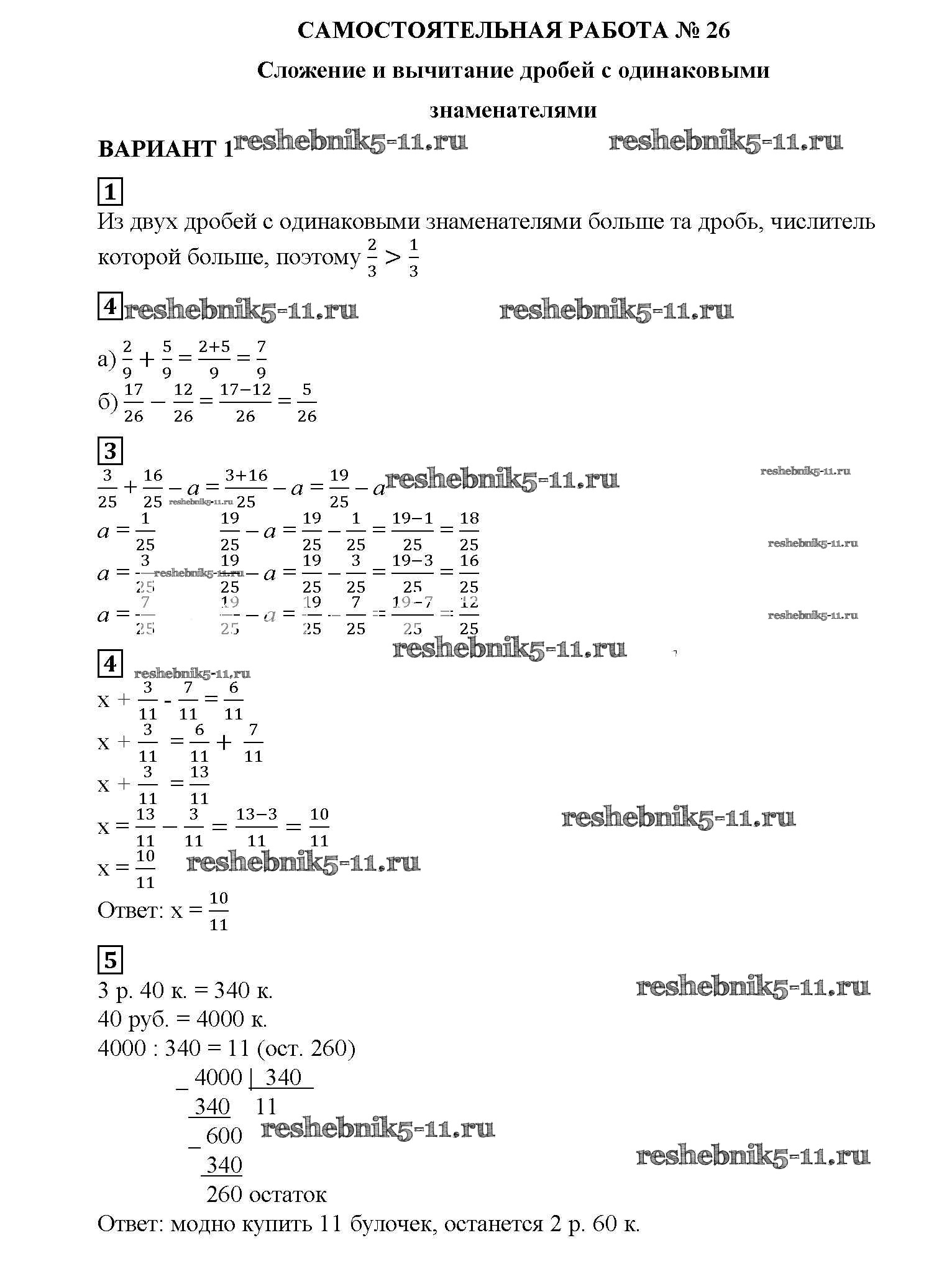 Готовая домашняя работа с ответами по Математике за 5 класс Попов Дидактические материалы УМК Экзамен 2017 ФГОС - СР №26. Сложение и вычитание дробей с одинаковыми знаменателями вариант №1