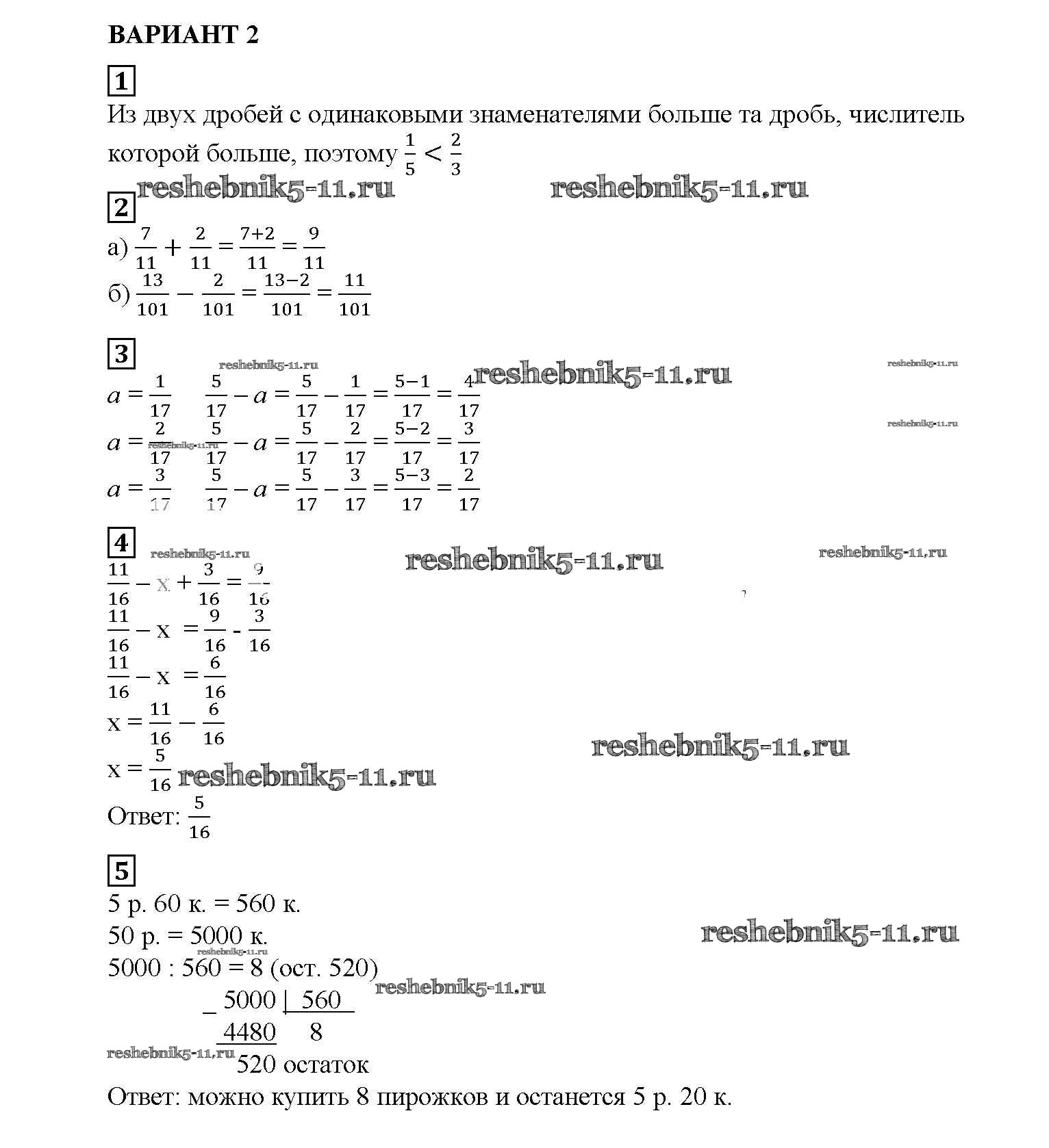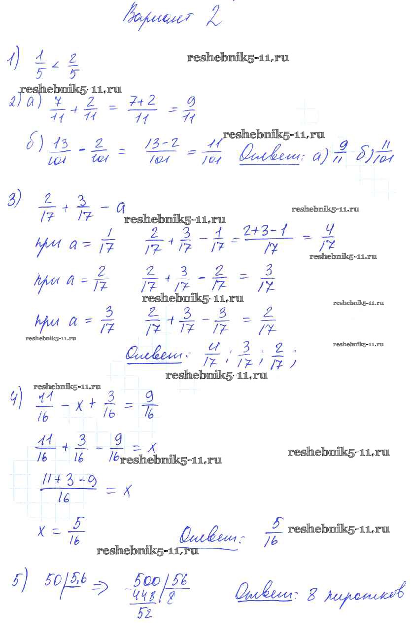 Готовая домашняя работа с ответами по Математике за 5 класс Попов Дидактические материалы УМК Экзамен 2017 ФГОС - СР №26. Сложение и вычитание дробей с одинаковыми знаменателями вариант №2