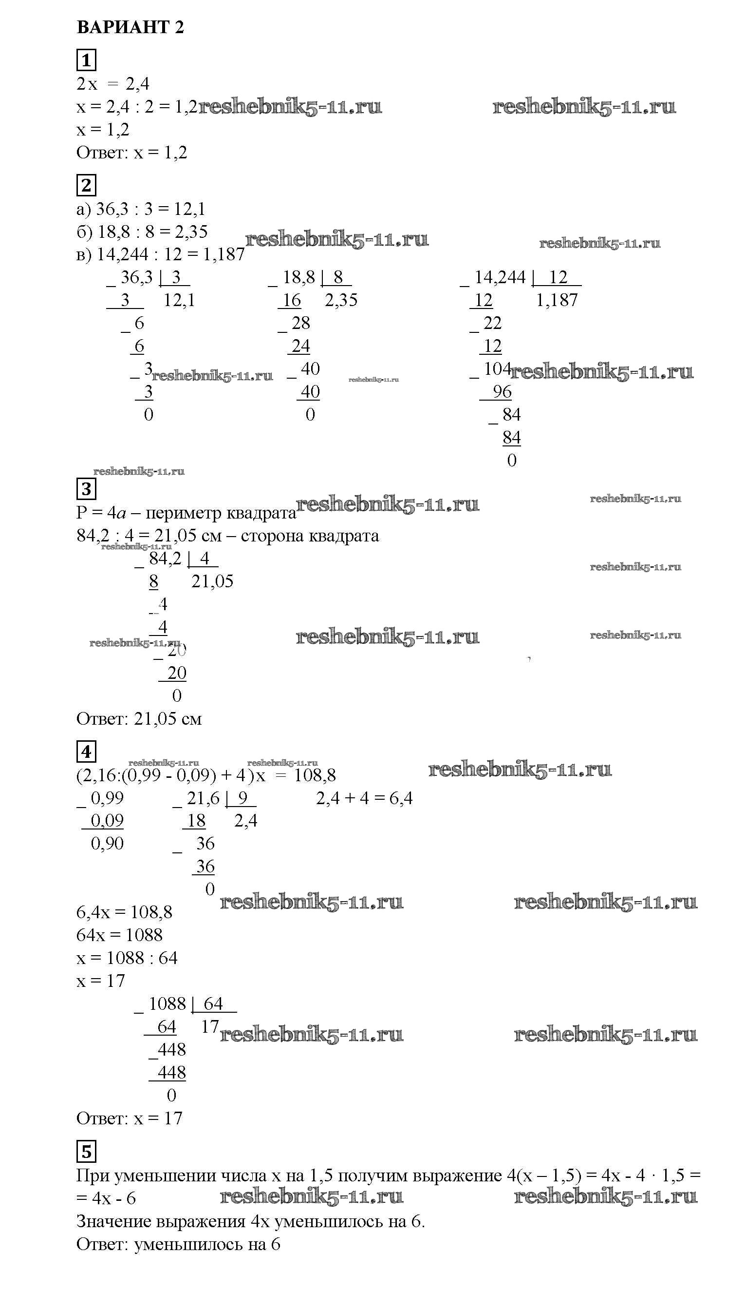 Готовая домашняя работа с ответами по Математике за 5 класс Попов Дидактические материалы УМК Экзамен 2017 ФГОС - СР №35. Деление десятичных дробей на натуральные числа вариант №2