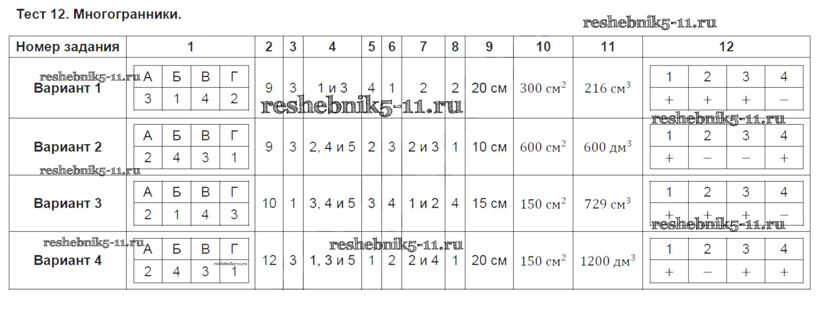 Готовая домашняя работа с ответами по Математике за 5 класс Кузнецова, Минаева, Рослова, Суворова Тематические тесты Просвещение 2018 ФГОС - Тесты Тест №12. Многогранники