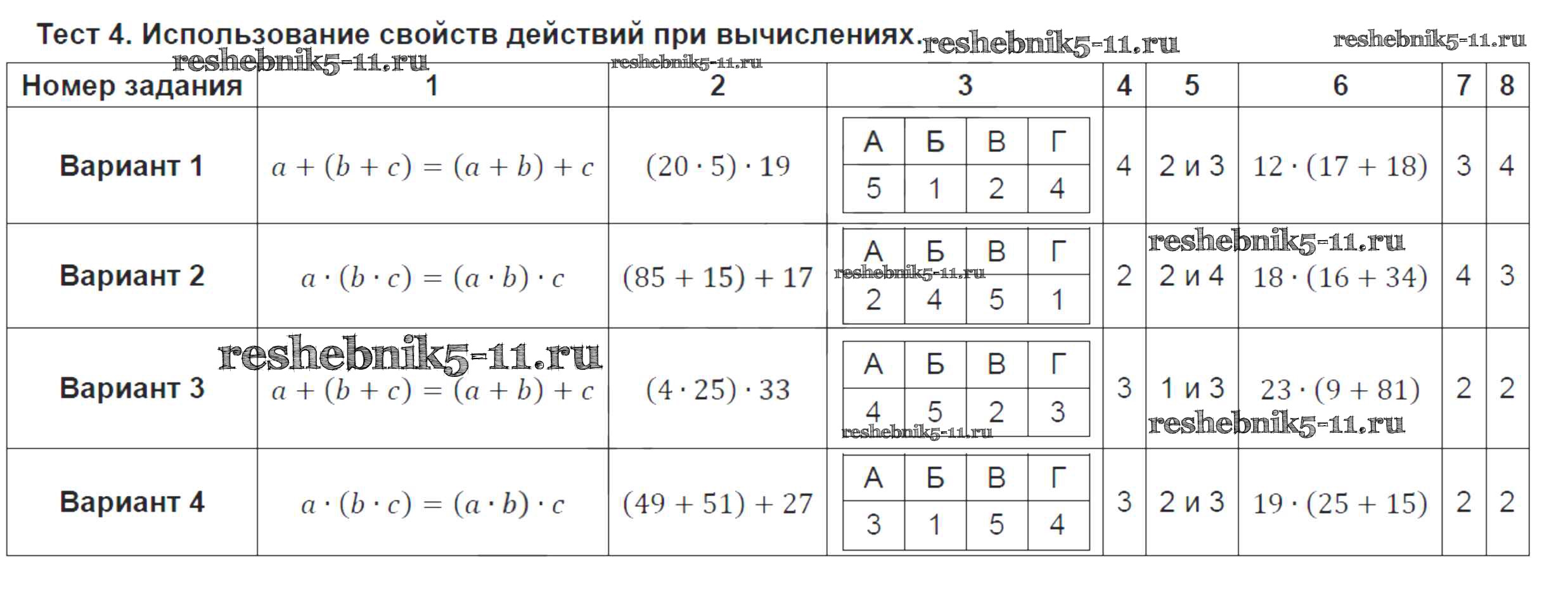 Готовая домашняя работа с ответами по Математике за 5 класс Кузнецова, Минаева, Рослова, Суворова Тематические тесты Просвещение 2018 ФГОС - Тесты Тест №4. Использование свойств действий при вычислениях