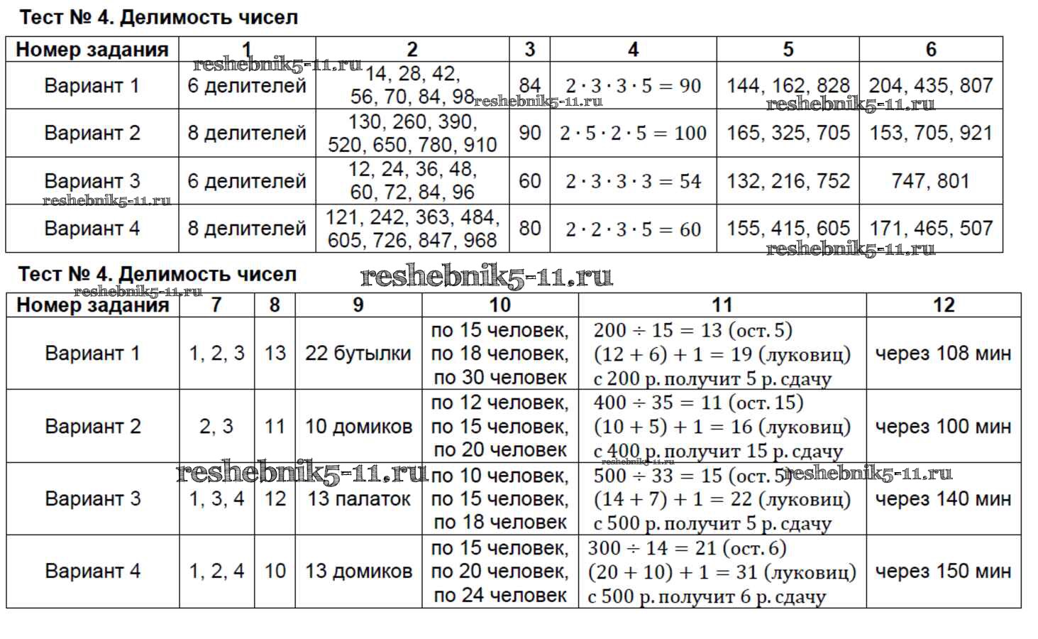 Готовая домашняя работа с ответами по Математике за 5 класс Минаева Тесты УМК Экзамен 2016 ФГОС - Тесты Тест №4. Делимость чисел