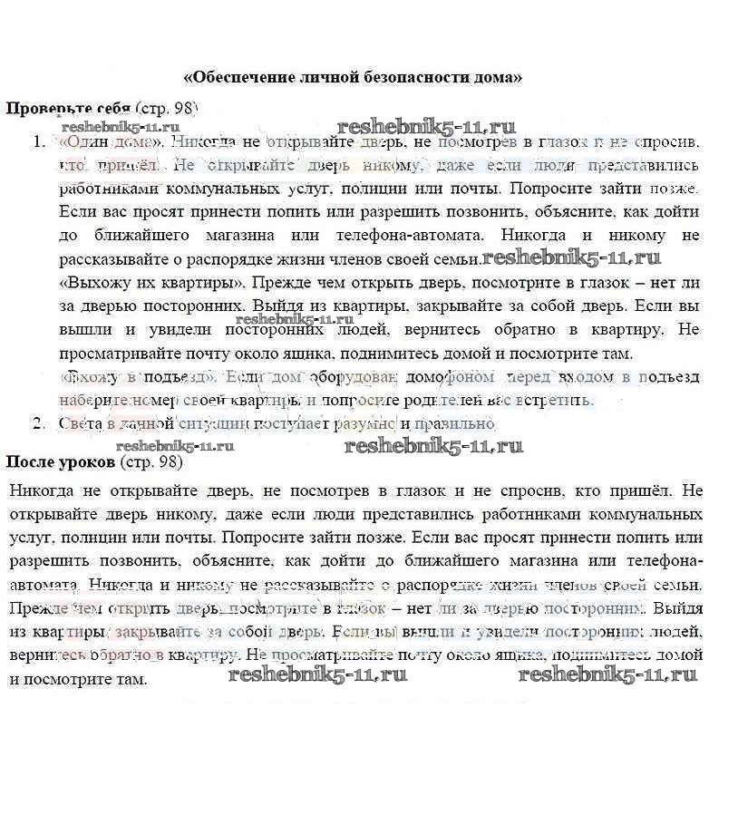 Готовая домашняя работа с ответами по ОБЖ за 5 класс Смирнов, Хренников Учебник Просвещение 2016 ФГОС - Страницы 98