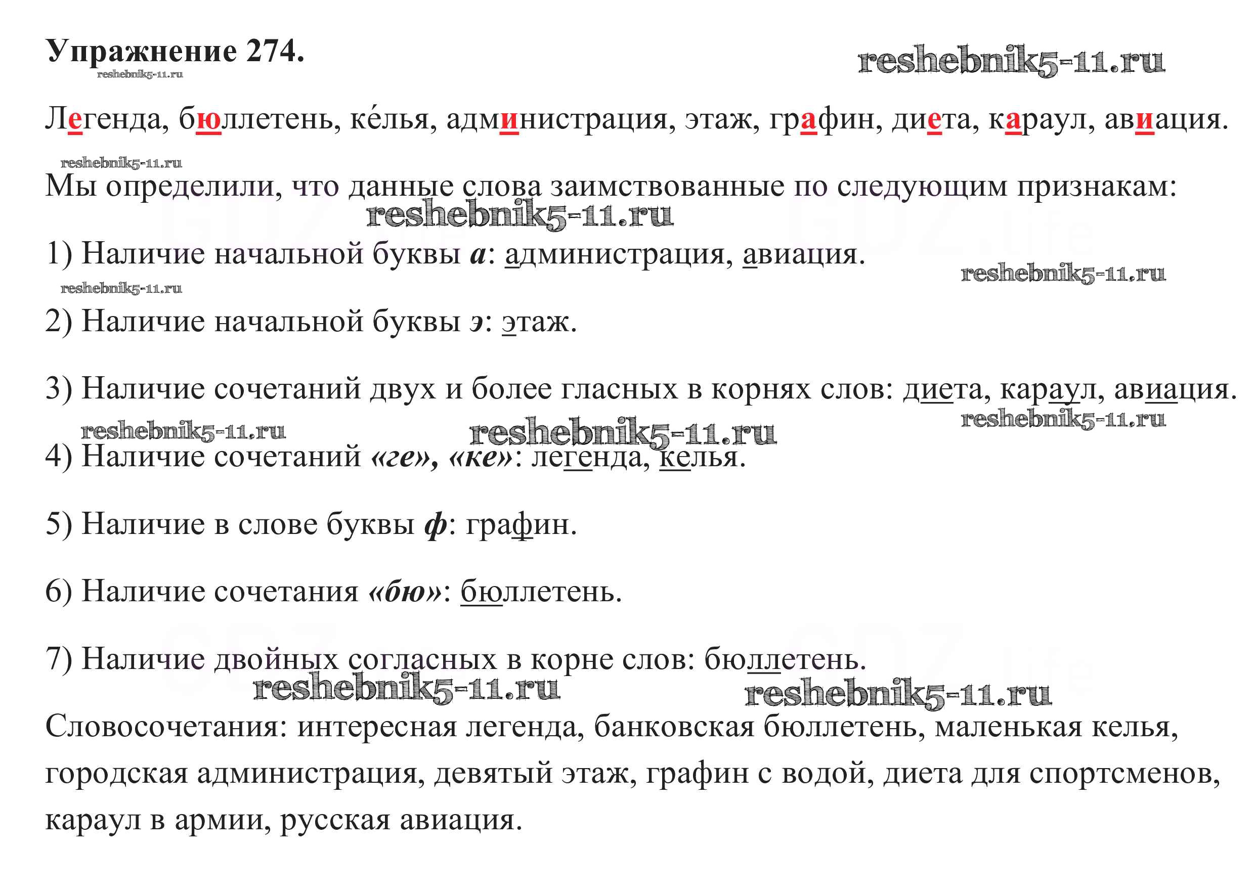 Готовая домашняя работа с ответами по Русскому языку за 5 класс Разумовская, Львова, Капинос, Львов, Богданова, Тронина, Сергеева Учебник Дрофа 2014 ФГОС - Упражнения 274