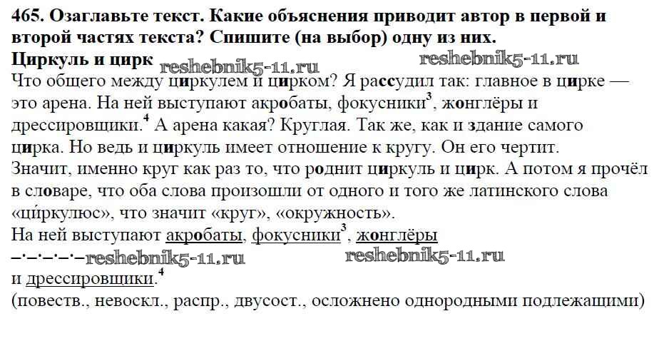 Готовая домашняя работа с ответами по Русскому языку за 5 класс Баранов, Ладыженская, Тростенцова, Кулибаба, Григорян Учебник Часть 1, 2 Просвещение 2016 ФГОС - Часть 2. Упражнения 465