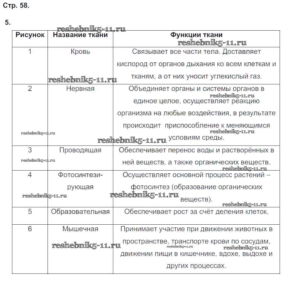 Готовая домашняя работа с ответами по Биологии за 5, 6 класс Сухорукова, Кучменко, Дмитриева Тетрадь-тренажер Сферы Часть 1, 2 Просвещение 2016 ФГОС - Часть 1. Страницы 58