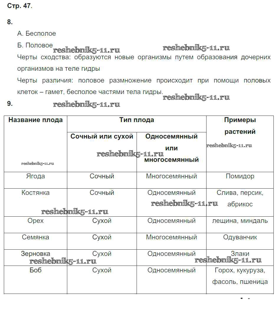 Готовая домашняя работа с ответами по Биологии за 5, 6 класс Сухорукова, Кучменко, Дмитриева Тетрадь-тренажер Сферы Часть 1, 2 Просвещение 2016 ФГОС - Часть 2. Страницы 47