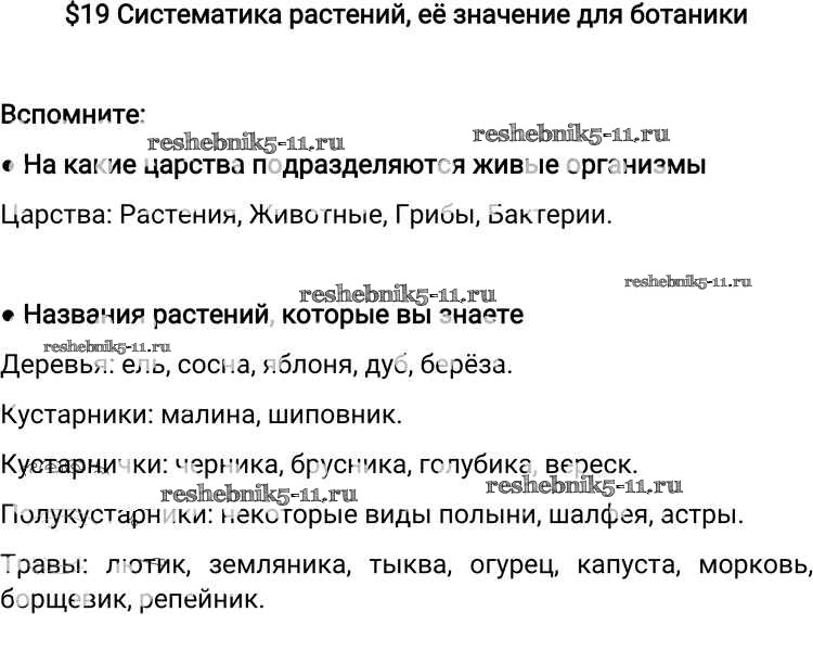 Готовая домашняя работа с ответами по Биологии за 6 класс Пономарева, Корнилова, Кучменко Учебник Алгоритм успеха Вентана-граф 2018 ФГОС - §19. Систематика растений, её значение для ботаники Вспомните