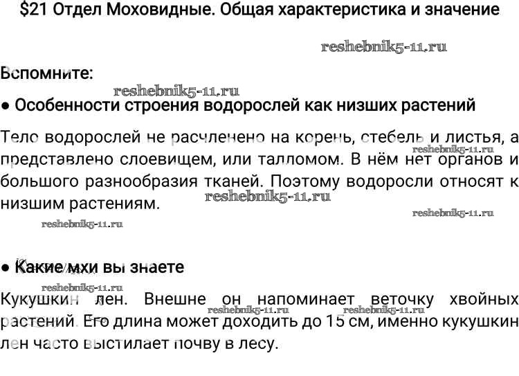 Готовая домашняя работа с ответами по Биологии за 6 класс Пономарева, Корнилова, Кучменко Учебник Алгоритм успеха Вентана-граф 2018 ФГОС - §21. Отдел Моховидные. Общая характеристика и значение Вспомните