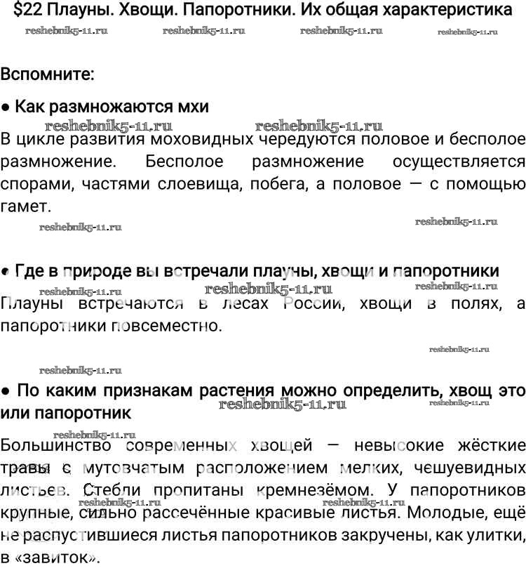 Готовая домашняя работа с ответами по Биологии за 6 класс Пономарева, Корнилова, Кучменко Учебник Алгоритм успеха Вентана-граф 2018 ФГОС - §22. Плауны. Хвощи. Папоротники Вспомните