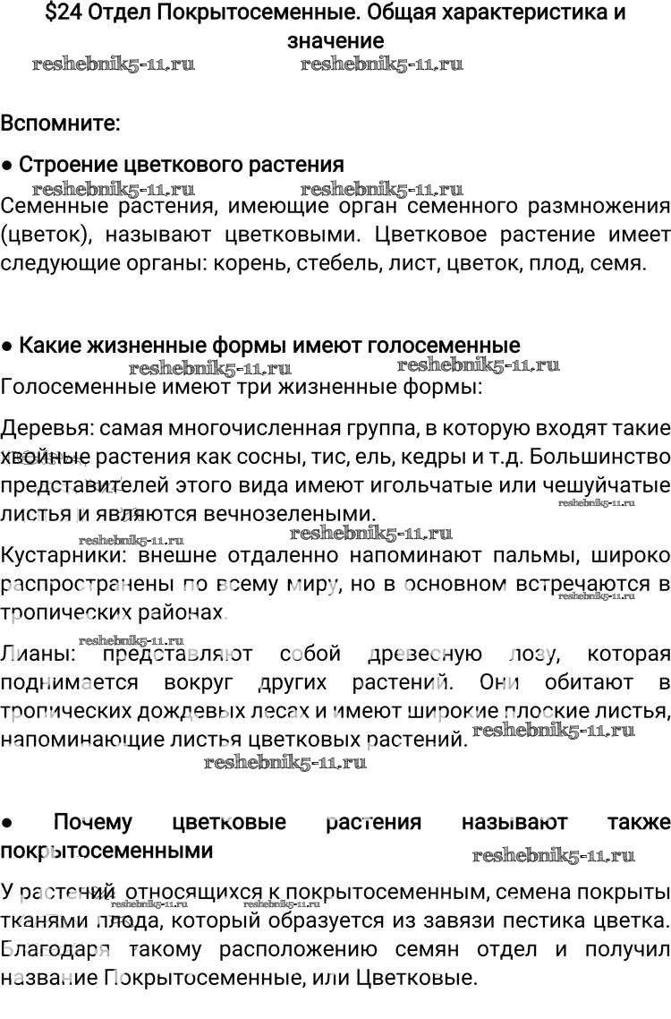 Готовая домашняя работа с ответами по Биологии за 6 класс Пономарева, Корнилова, Кучменко Учебник Алгоритм успеха Вентана-граф 2018 ФГОС - §24. Отдел Покрытосеменные. Общая характеристика и значение Вспомните