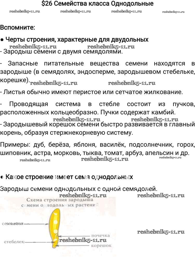 Готовая домашняя работа с ответами по Биологии за 6 класс Пономарева, Корнилова, Кучменко Учебник Алгоритм успеха Вентана-граф 2018 ФГОС - §26. Семейства класса Однодольные Вспомните