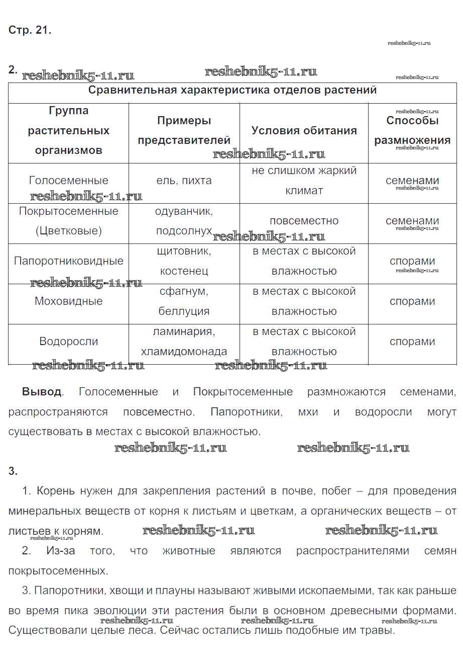 Готовая домашняя работа с ответами по Биологии за 6 класс Пономарева, Корнилова, Кучменко Рабочая тетрадь Алгоритм успеха Часть 1, 2 Вентана-граф 2020 ФГОС - Часть 2. Страницы 21