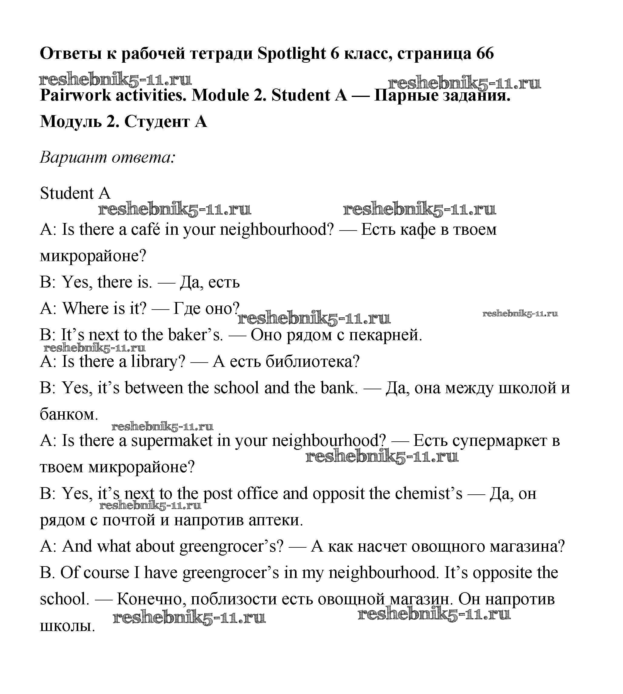 Готовая домашняя работа с ответами по Английскому языку за 6 класс Эванс, Дули, Подоляко, Ваулина Рабочая тетрадь Spotlight Просвещение 2011 - Страницы 66