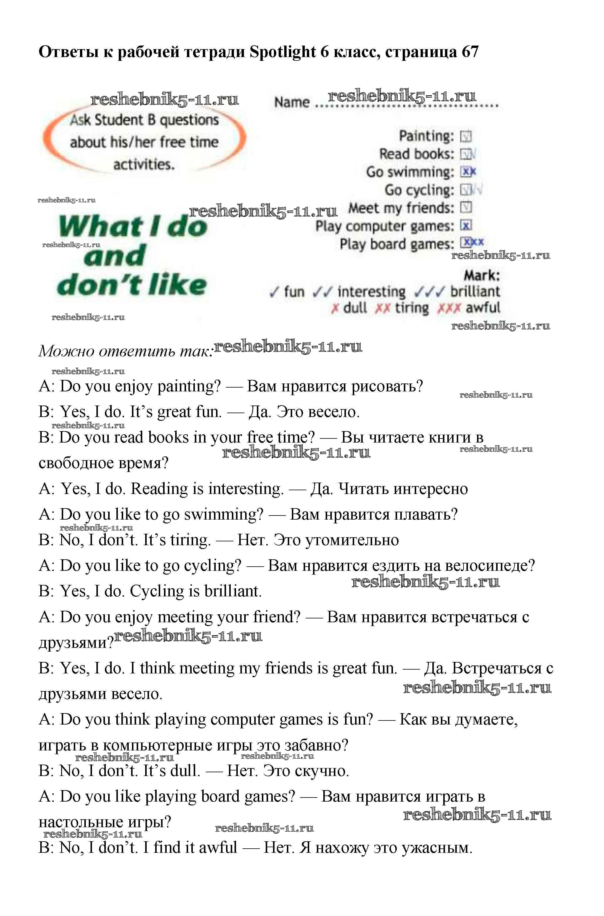 Готовая домашняя работа с ответами по Английскому языку за 6 класс Эванс, Дули, Подоляко, Ваулина Рабочая тетрадь Spotlight Просвещение 2011 - Страницы 67