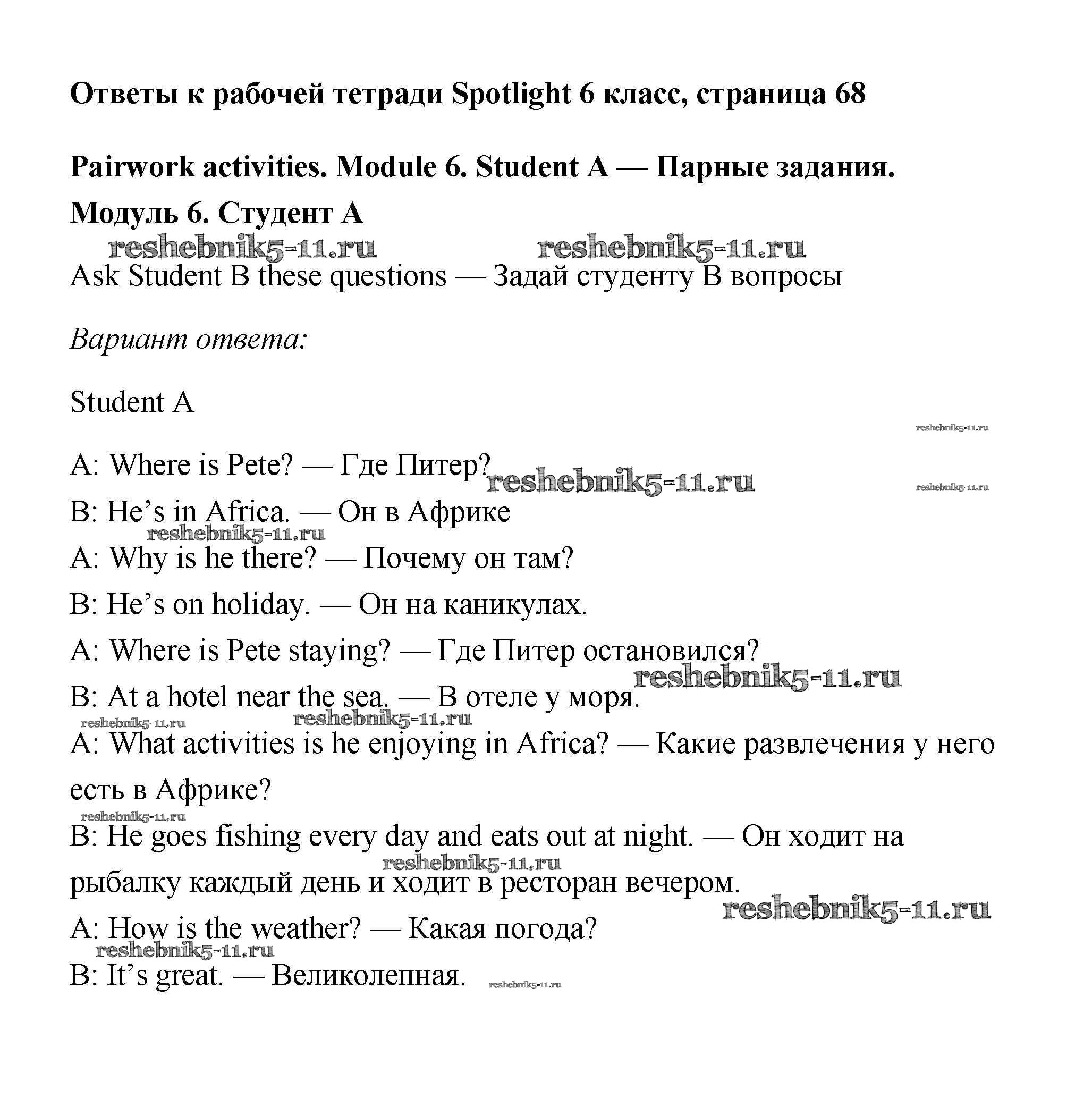 Готовая домашняя работа с ответами по Английскому языку за 6 класс Эванс, Дули, Подоляко, Ваулина Рабочая тетрадь Spotlight Просвещение 2011 - Страницы 68