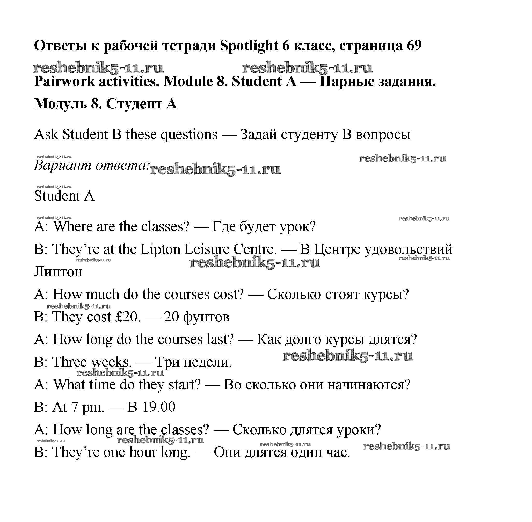 Готовая домашняя работа с ответами по Английскому языку за 6 класс Эванс, Дули, Подоляко, Ваулина Рабочая тетрадь Spotlight Просвещение 2011 - Страницы 69