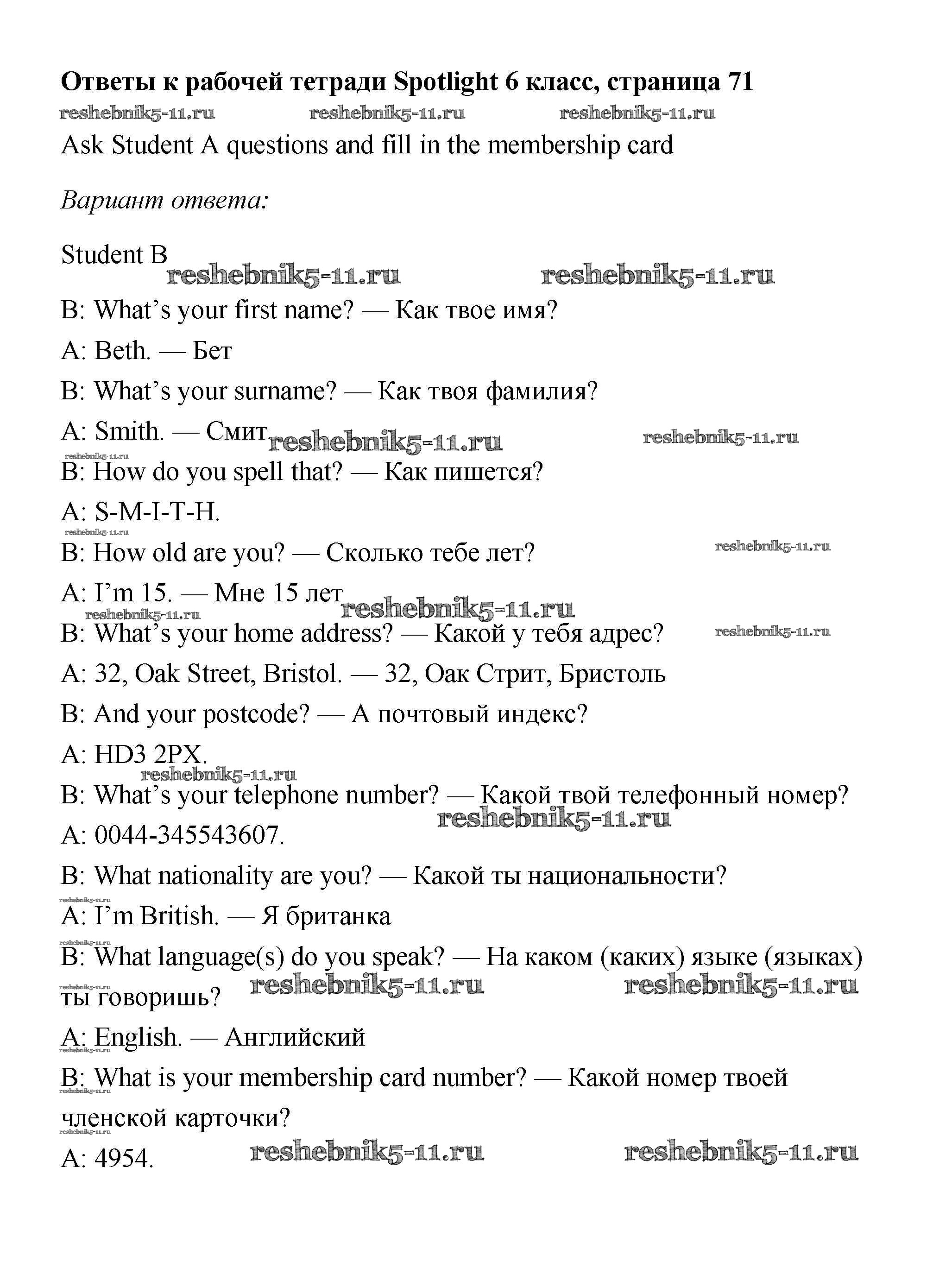 Готовая домашняя работа с ответами по Английскому языку за 6 класс Эванс, Дули, Подоляко, Ваулина Рабочая тетрадь Spotlight Просвещение 2011 - Страницы 71