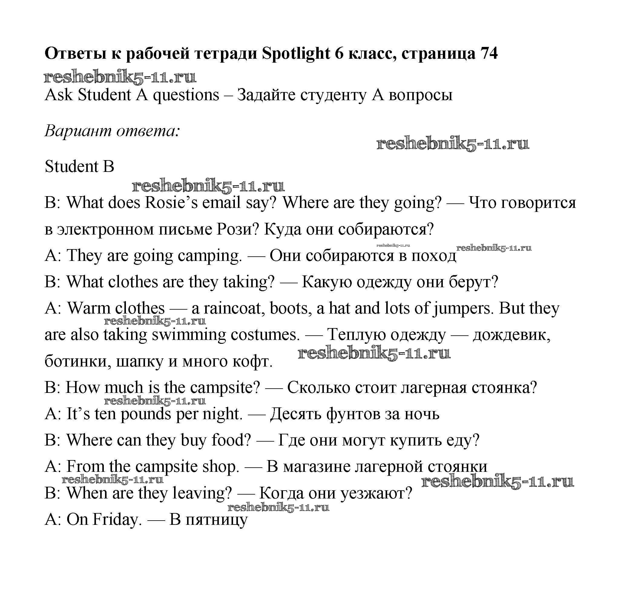 Готовая домашняя работа с ответами по Английскому языку за 6 класс Эванс, Дули, Подоляко, Ваулина Рабочая тетрадь Spotlight Просвещение 2011 - Страницы 74
