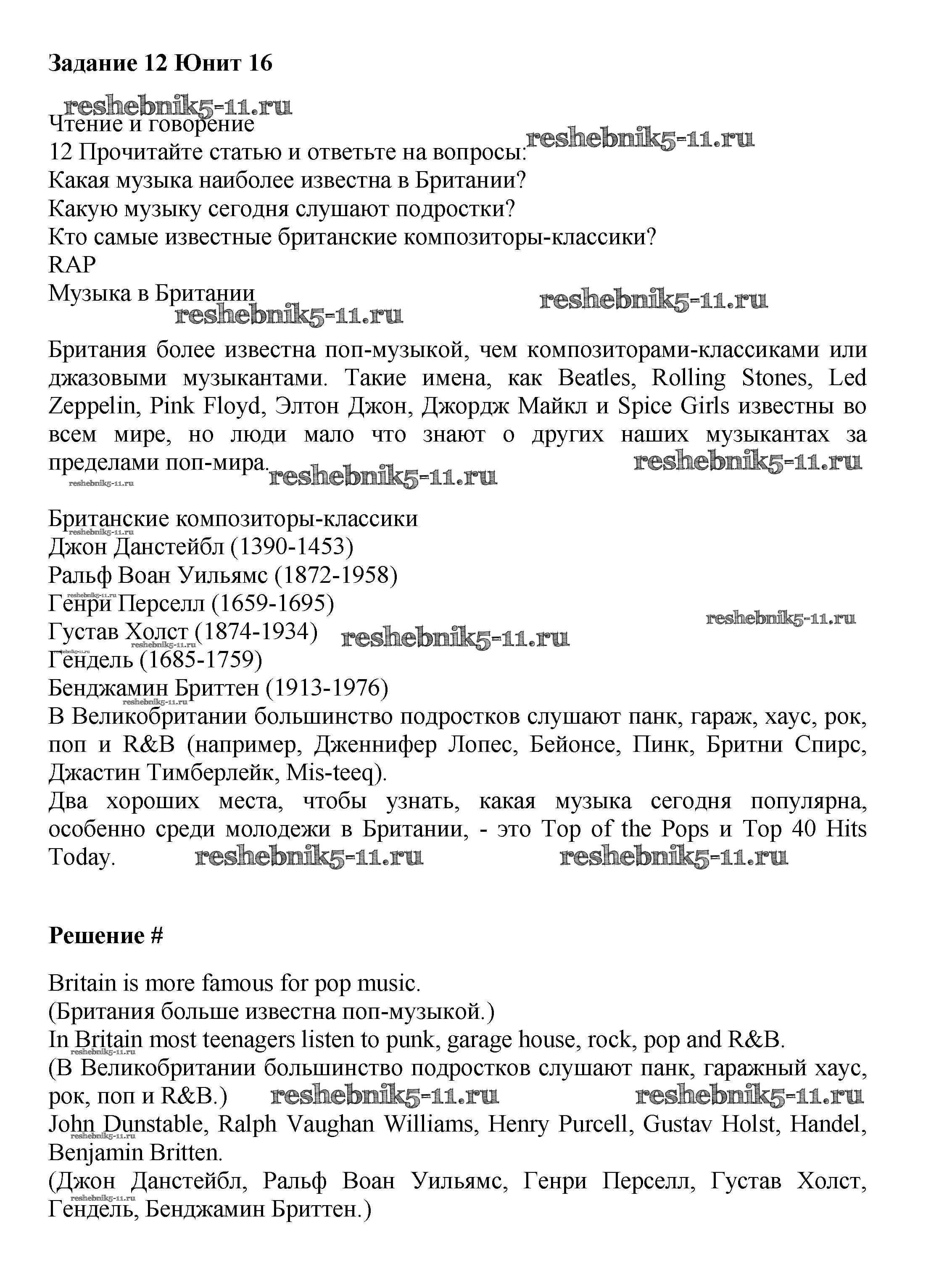 Готовая домашняя работа с ответами по Английскому языку за 6 класс Вербицкая, Гаярделли, Редли, Савчук Учебник Forward Часть 1, 2 Вентана-граф 2017 ФГОС - Unit 16. The world of music 12