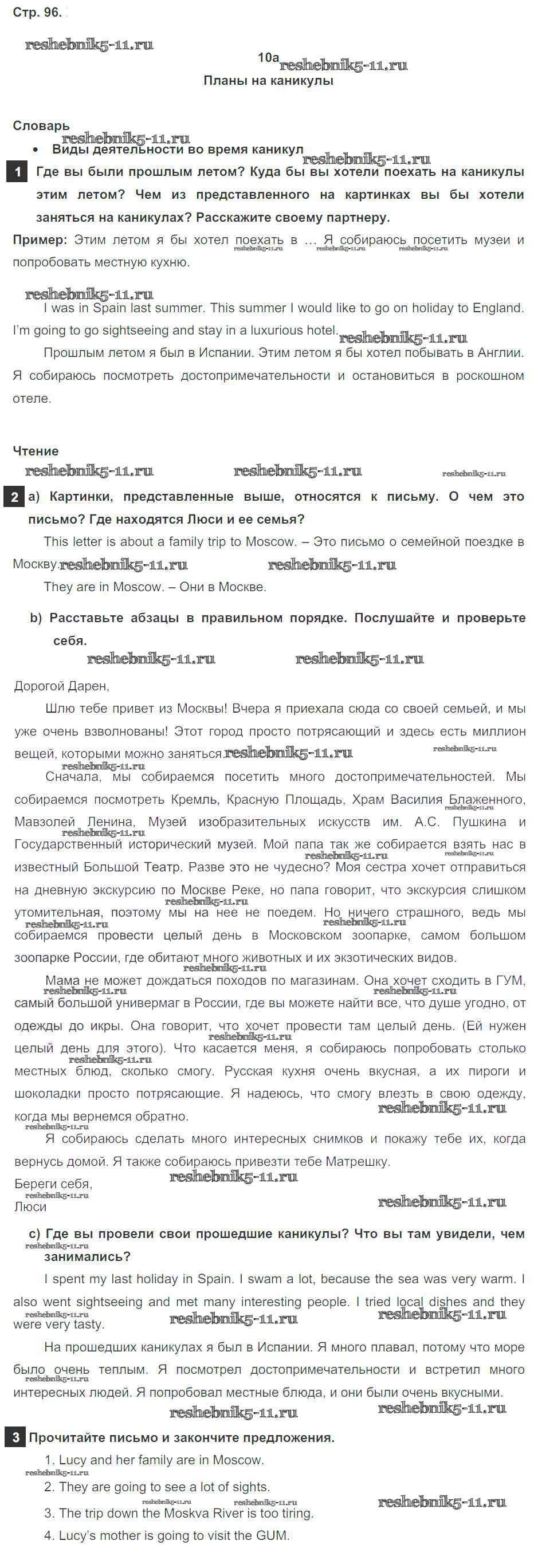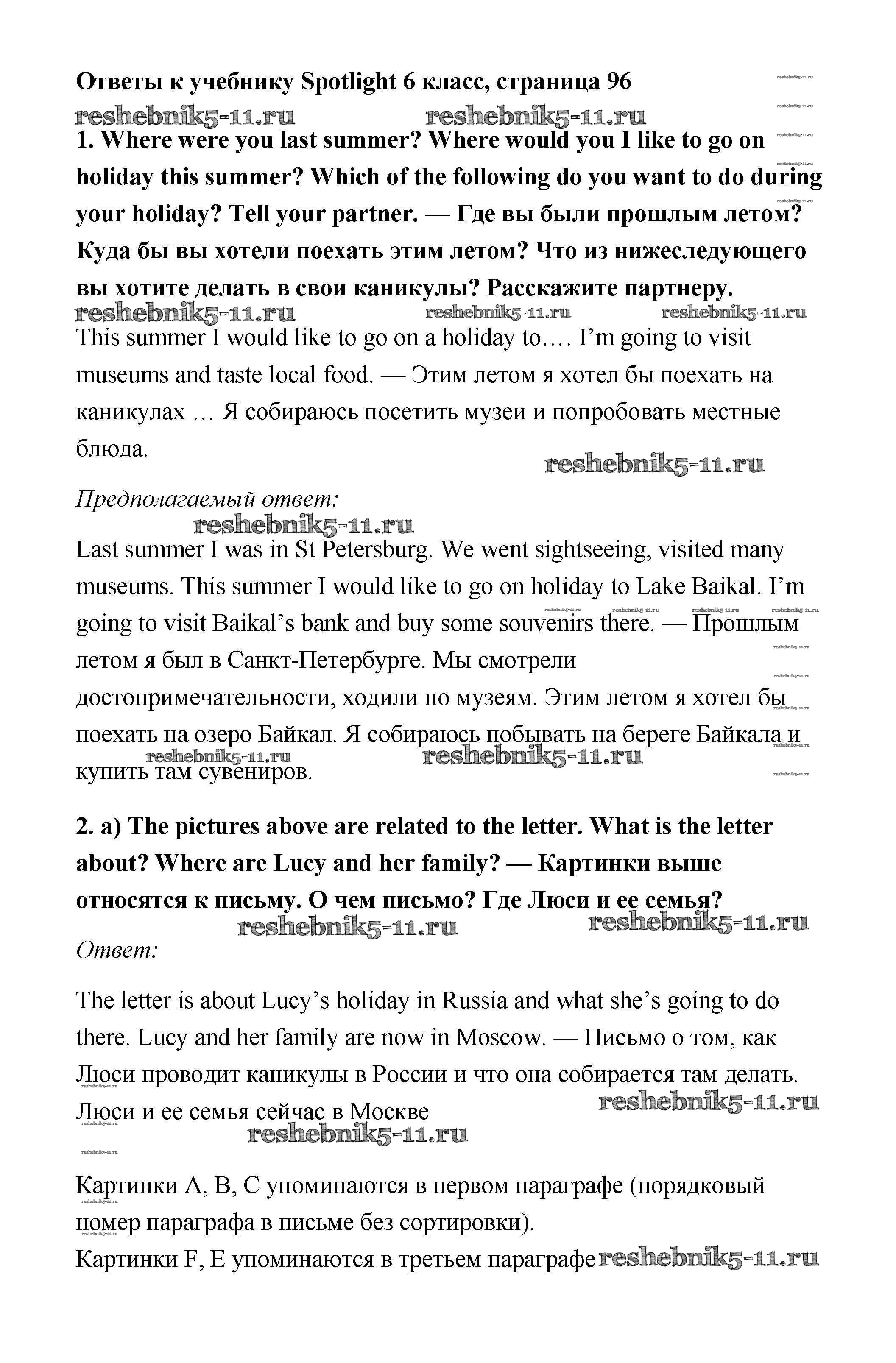 Готовая домашняя работа с ответами по Английскому языку за 6 класс Ваулина, Дули, Эванс, Подоляко Учебник Spotlight Просвещение 2017 ФГОС - Module 10. Holiday Time. Страницы 96