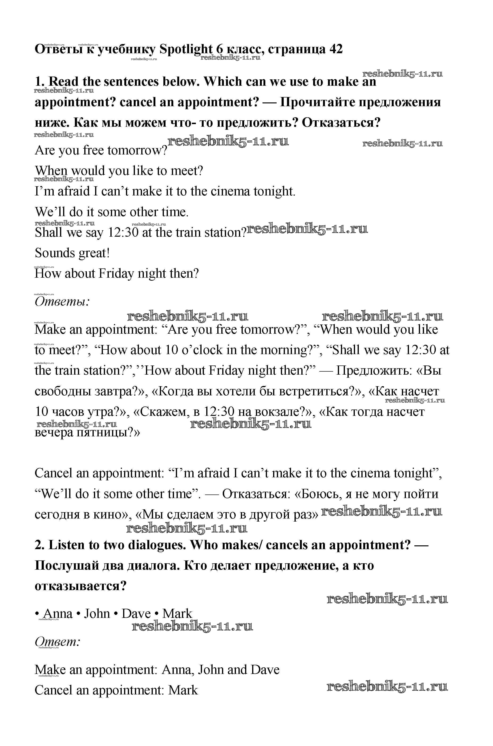 Готовая домашняя работа с ответами по Английскому языку за 6 класс Ваулина, Дули, Эванс, Подоляко Учебник Spotlight Просвещение 2017 ФГОС - Module 4. Day after day. Страницы 42