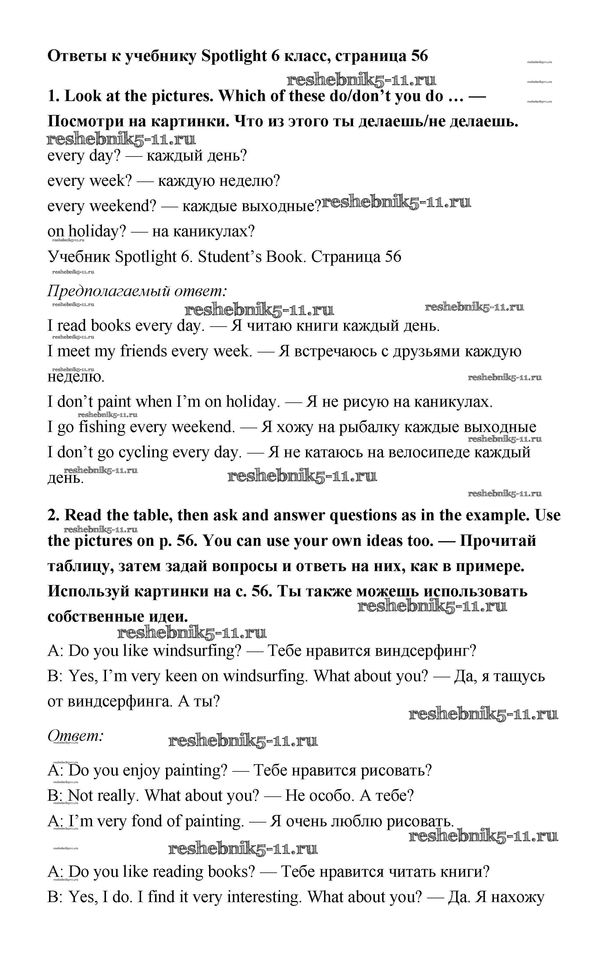 Готовая домашняя работа с ответами по Английскому языку за 6 класс Ваулина, Дули, Эванс, Подоляко Учебник Spotlight Просвещение 2017 ФГОС - Module 6. Leisure activities. Страницы 56