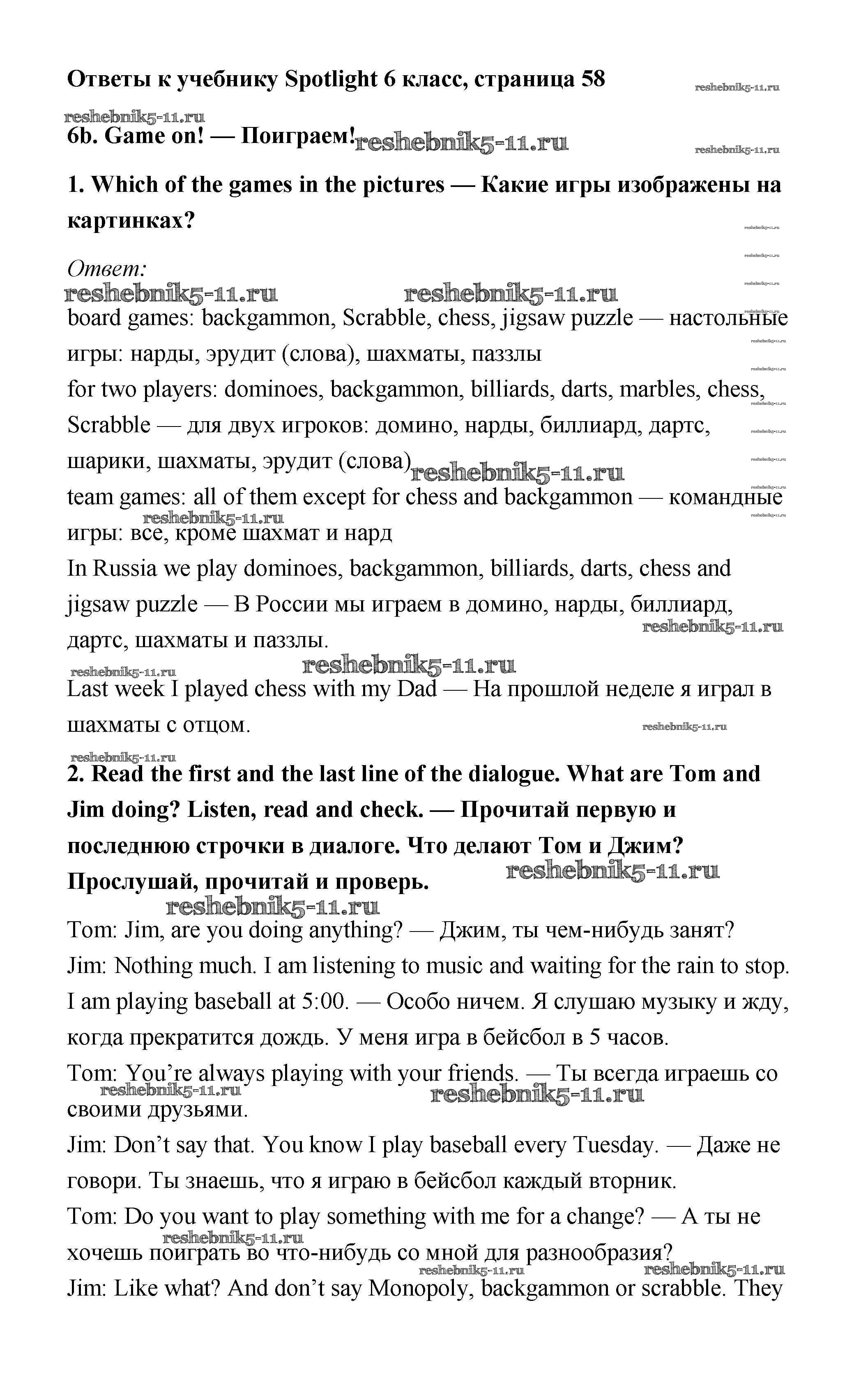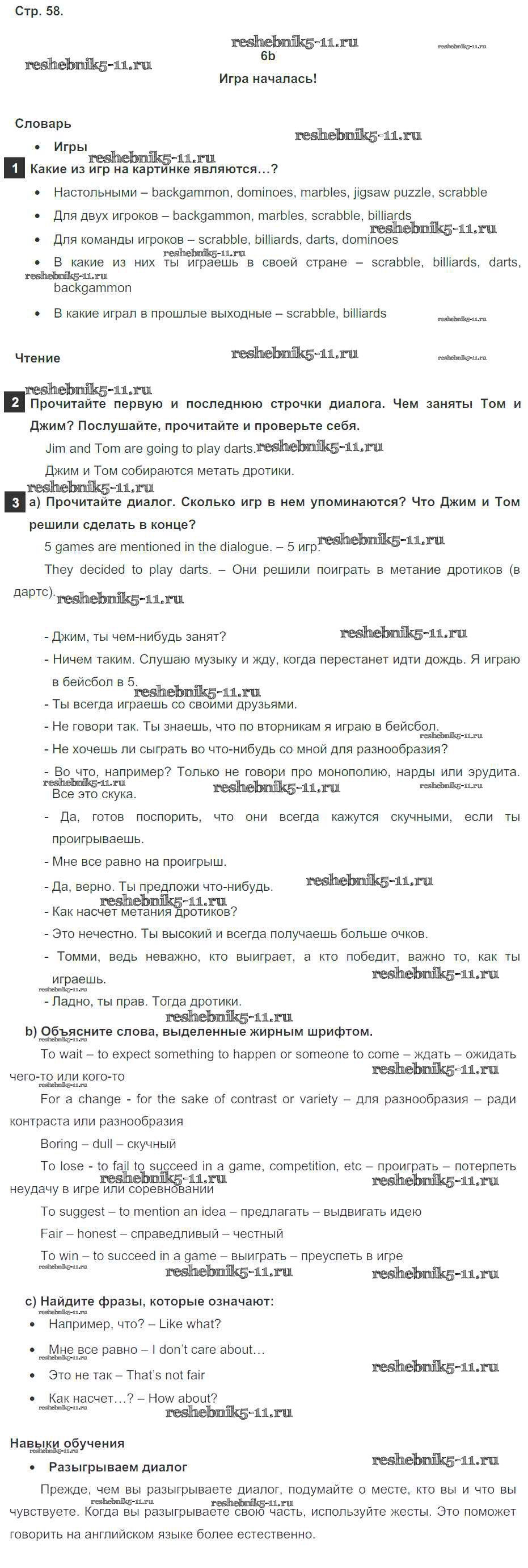 Готовая домашняя работа с ответами по Английскому языку за 6 класс Ваулина, Дули, Эванс, Подоляко Учебник Spotlight Просвещение 2017 ФГОС - Module 6. Leisure activities. Страницы 58