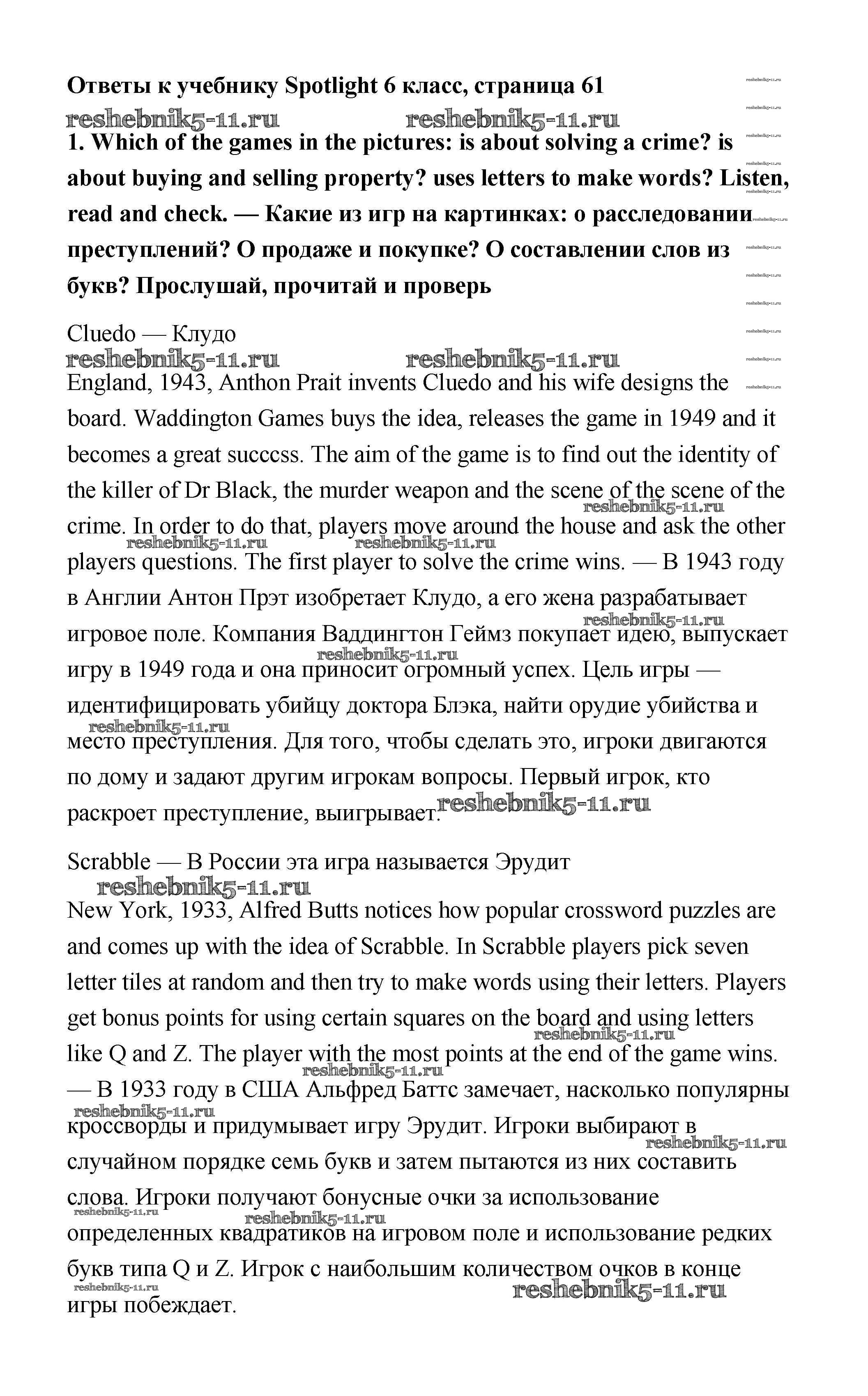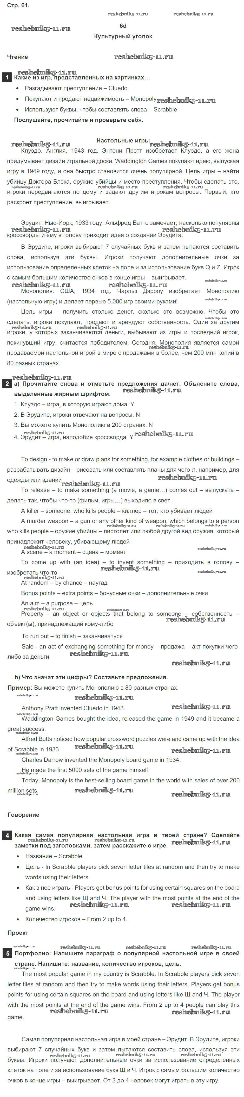 Готовая домашняя работа с ответами по Английскому языку за 6 класс Ваулина, Дули, Эванс, Подоляко Учебник Spotlight Просвещение 2017 ФГОС - Module 6. Leisure activities. Страницы 61