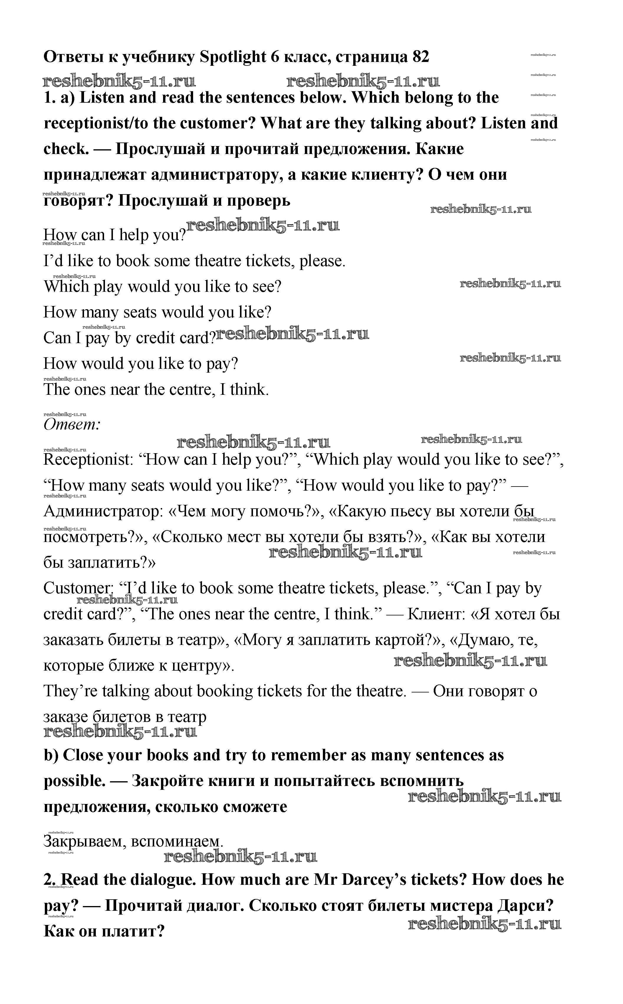 Готовая домашняя работа с ответами по Английскому языку за 6 класс Ваулина, Дули, Эванс, Подоляко Учебник Spotlight Просвещение 2017 ФГОС - Module 8. Rules & Regulations. Страницы 82
