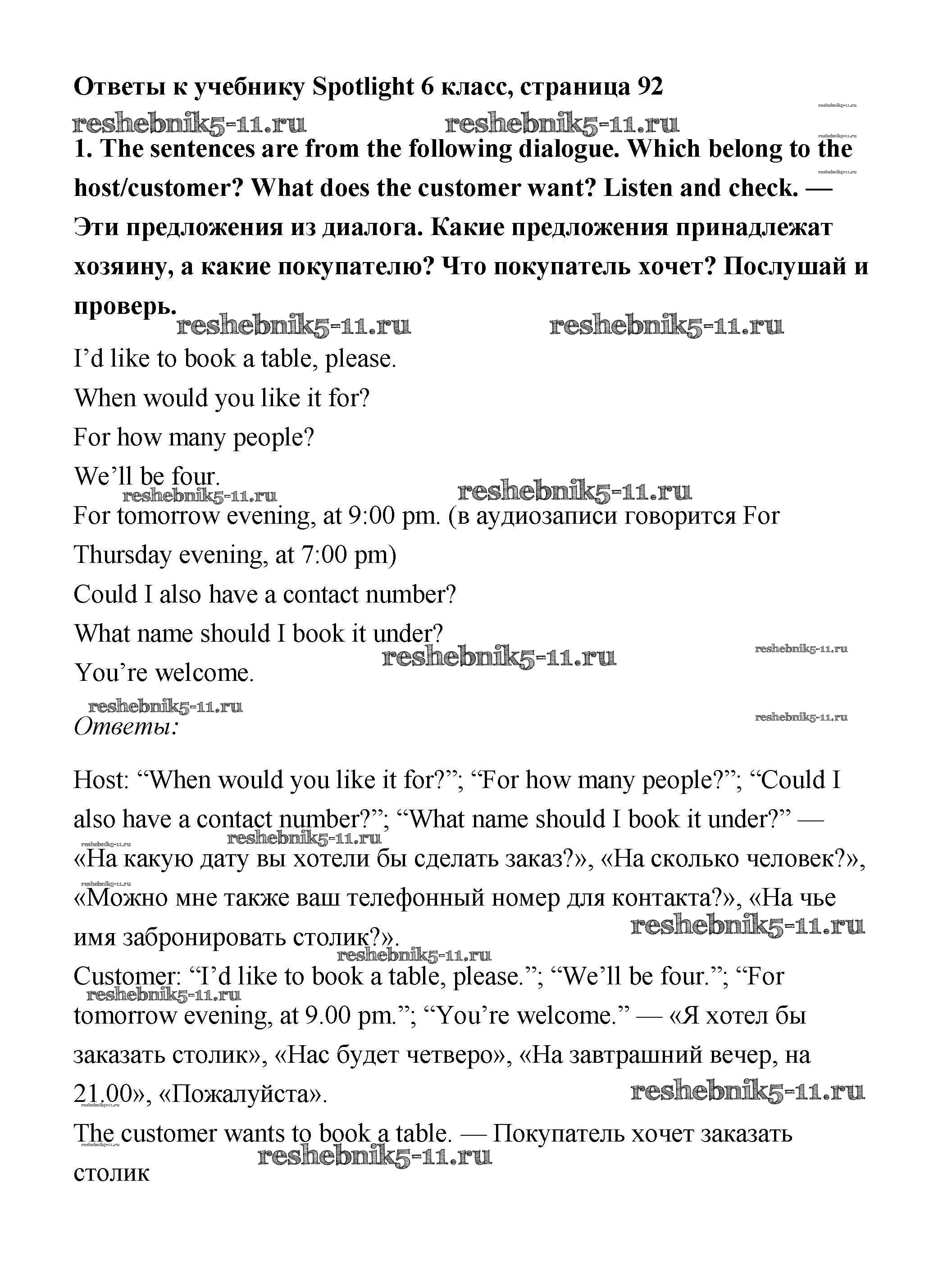 Готовая домашняя работа с ответами по Английскому языку за 6 класс Ваулина, Дули, Эванс, Подоляко Учебник Spotlight Просвещение 2017 ФГОС - Module 9. Food & Refreshments. Страницы 92