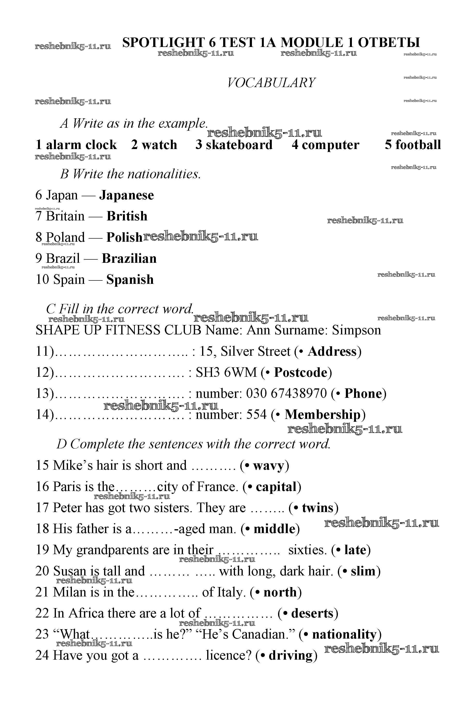 Готовая домашняя работа с ответами по Английскому языку за 6 класс Ваулина, Дули, Подоляко, Эванс Контрольные задания Spotlight Просвещение 2017 ФГОС - Тесты 1A