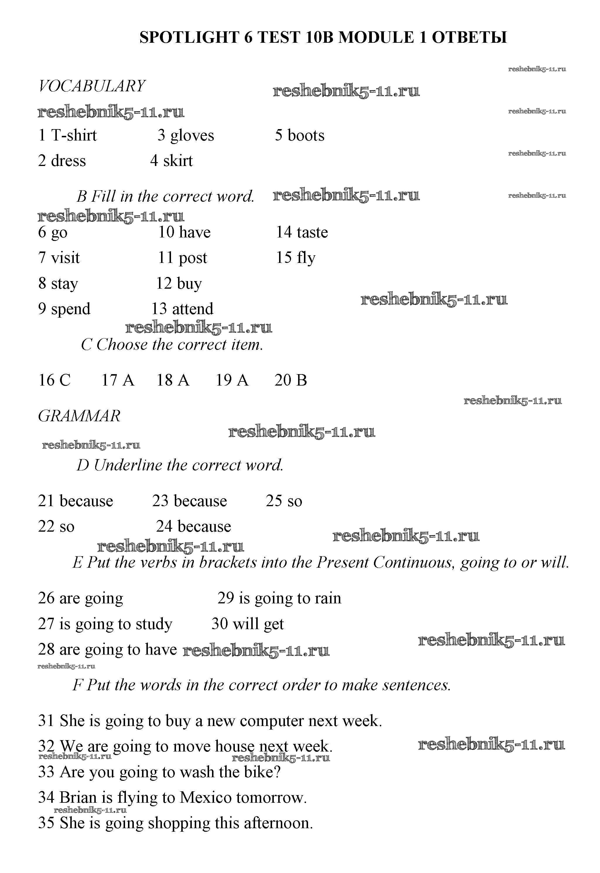 Готовая домашняя работа с ответами по Английскому языку за 6 класс Ваулина, Дули, Подоляко, Эванс Контрольные задания Spotlight Просвещение 2017 ФГОС - Тесты 10В