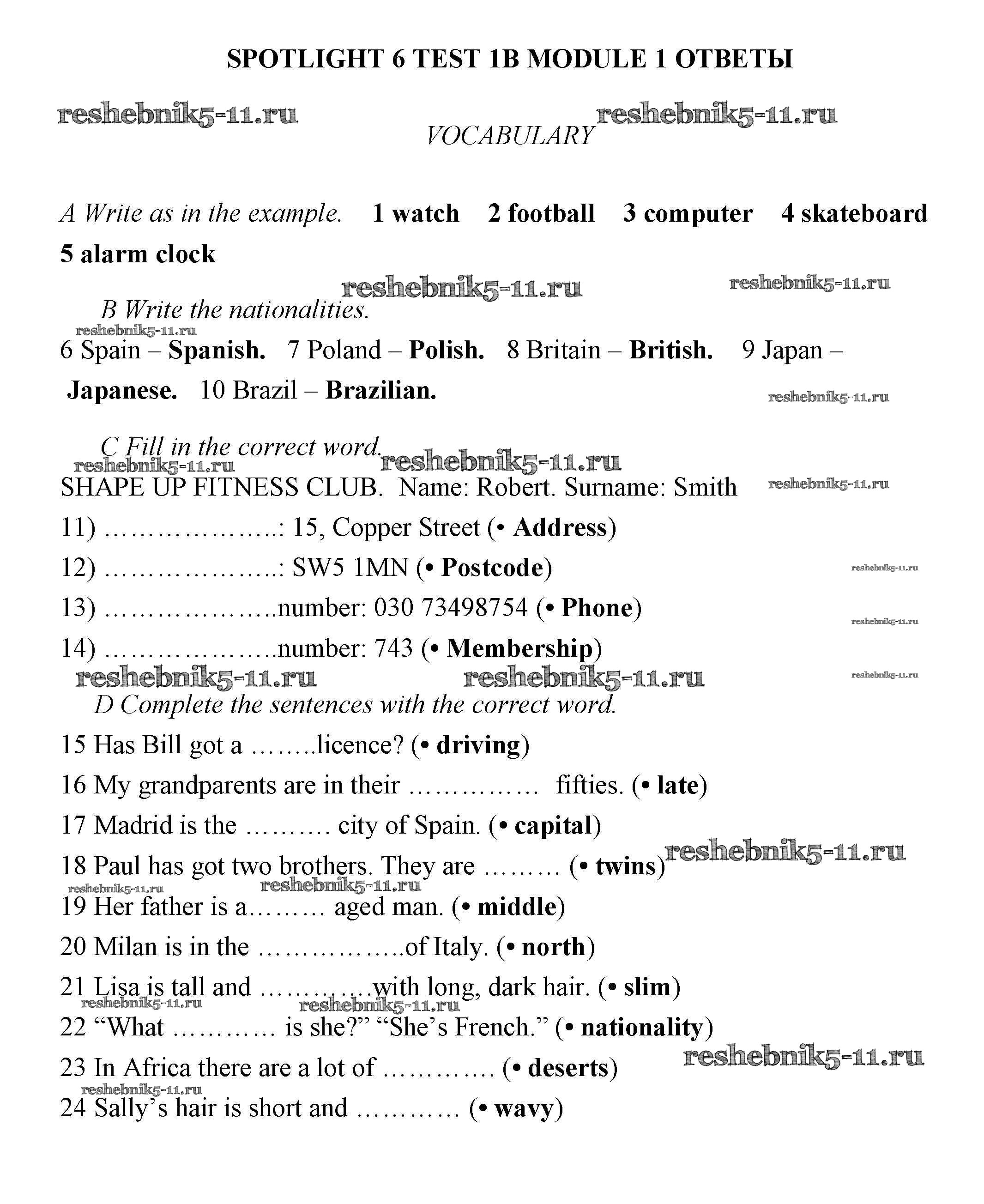 Готовая домашняя работа с ответами по Английскому языку за 6 класс Ваулина, Дули, Подоляко, Эванс Контрольные задания Spotlight Просвещение 2017 ФГОС - Тесты 1В