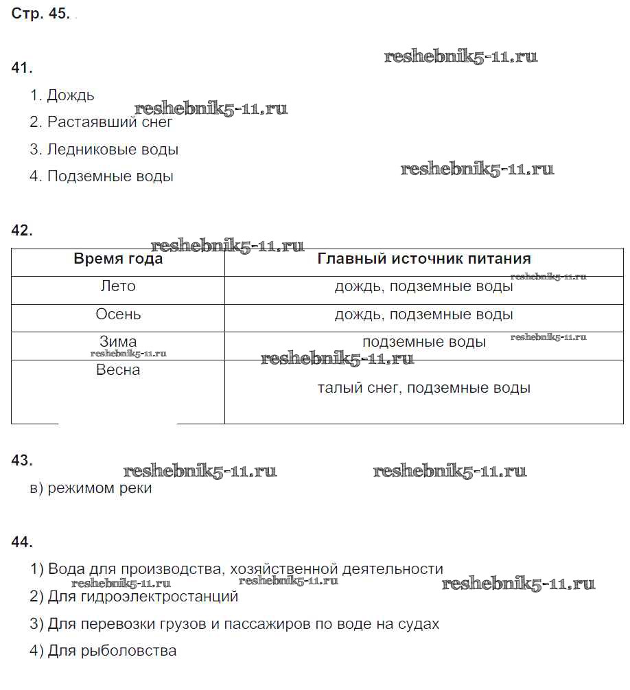 Готовая домашняя работа с ответами по Географии за 6 класс Дронов, Савельева Рабочая тетрадь Вертикаль Дрофа 2016 ФГОС - Гидросфера (страницы тетради) 45