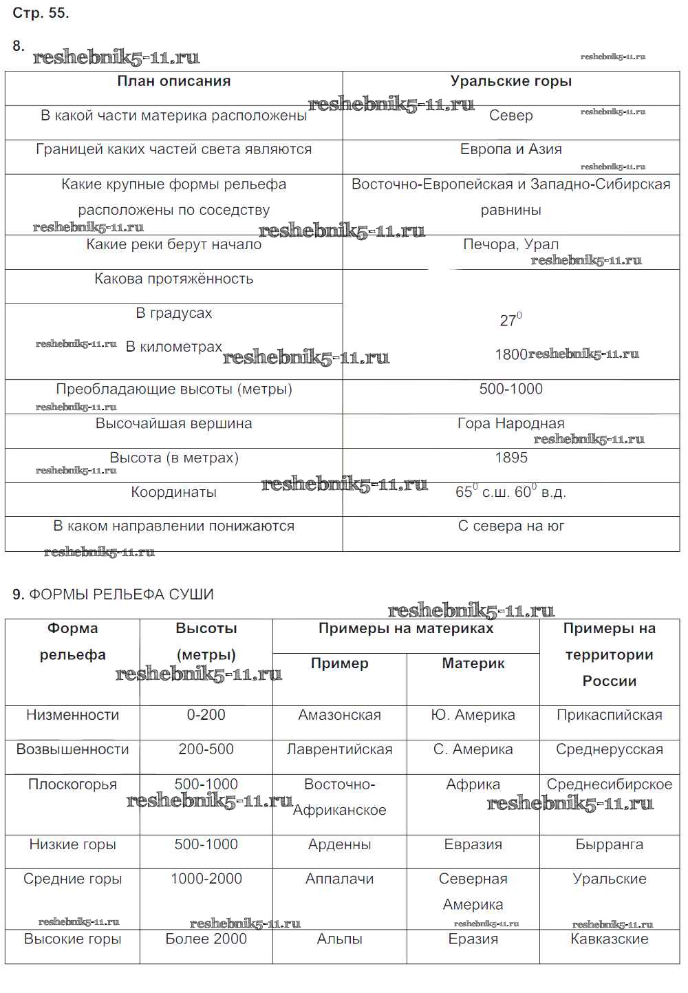 Готовая домашняя работа с ответами по Географии за 5, 6 класс Лобжанидзе Тетрадь-тренажер Сферы Часть 1, 2 Просвещение 2014 ФГОС - Часть 1. Страницы 55